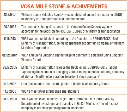 (VLR) (Vietnam Logistics Review) This March is a meaningful month of Vietnam Ocean Shipping Agency (VOSA) when it marks 60 years of foundation and continuously development of this corporation. Mentioned in the Decree no.50-ND signed by Ministry of Transportation and Communication, the Vietnam Ocean Shipping Agency had firstly been established on 13th Mar 1957, being one of the first maritime companies in Vietnam at that time, and until now the VOSA ship has been going through the long journey of 60 years to the big ocean and get many important achievements.
