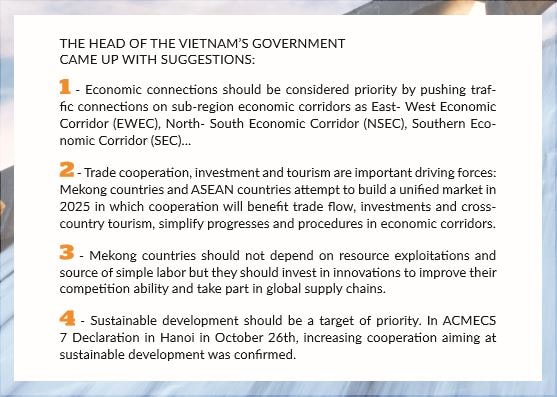Then, in the morning of October 26th, the 7th Ayeyawady-Chao Phraya-Mekong Economic Cooperation Strategy Summit (ACMECS 7) and the 8th Cambodia-Laos-Myanmar-Vietnam Summit (CLMV 8) officially started in Hanoi. In the opening speech, Nguyen Xuan Phuc- Vietnam’s Prime Minister asserted Mekong countries have become an important driving force of economy in South East Asia- one of the most dynamic region in the world. Vietnam takes CLMV and ACMECS seriously and is willing to cooperate with member countries and partners for peace and common wealth in the region.