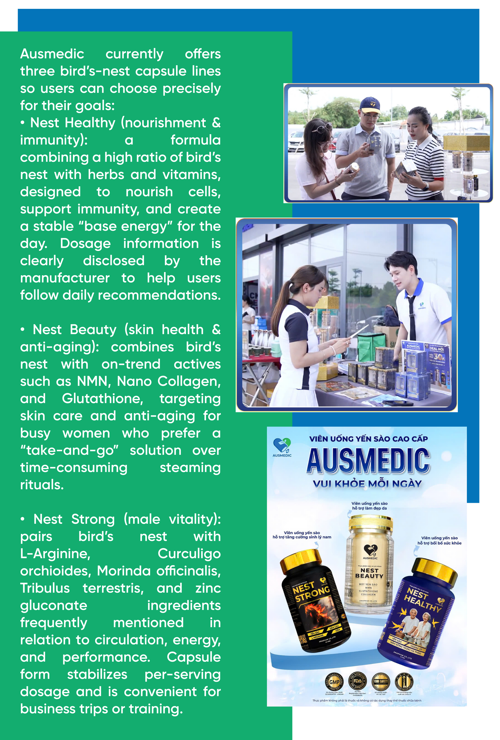 Ausmedic’s bird’s-nest capsules answer the balancing act between traditional value and modern standards. With GMP-grade capsule technology, clear quality documentation, and segmented product lines for different needs, the brand helps Vietnamese consumers use bird’s nest properly - adequately - regularly, reducing the hurdles of preparation and storage while affirming a “clean energy” benchmark that fits urban rhythms and an emerging culture of movement. When heritage is standardized by science and transparency, its value is not merely preserved it is elevated to travel farther and stand firmer on the map of premium functional foods.