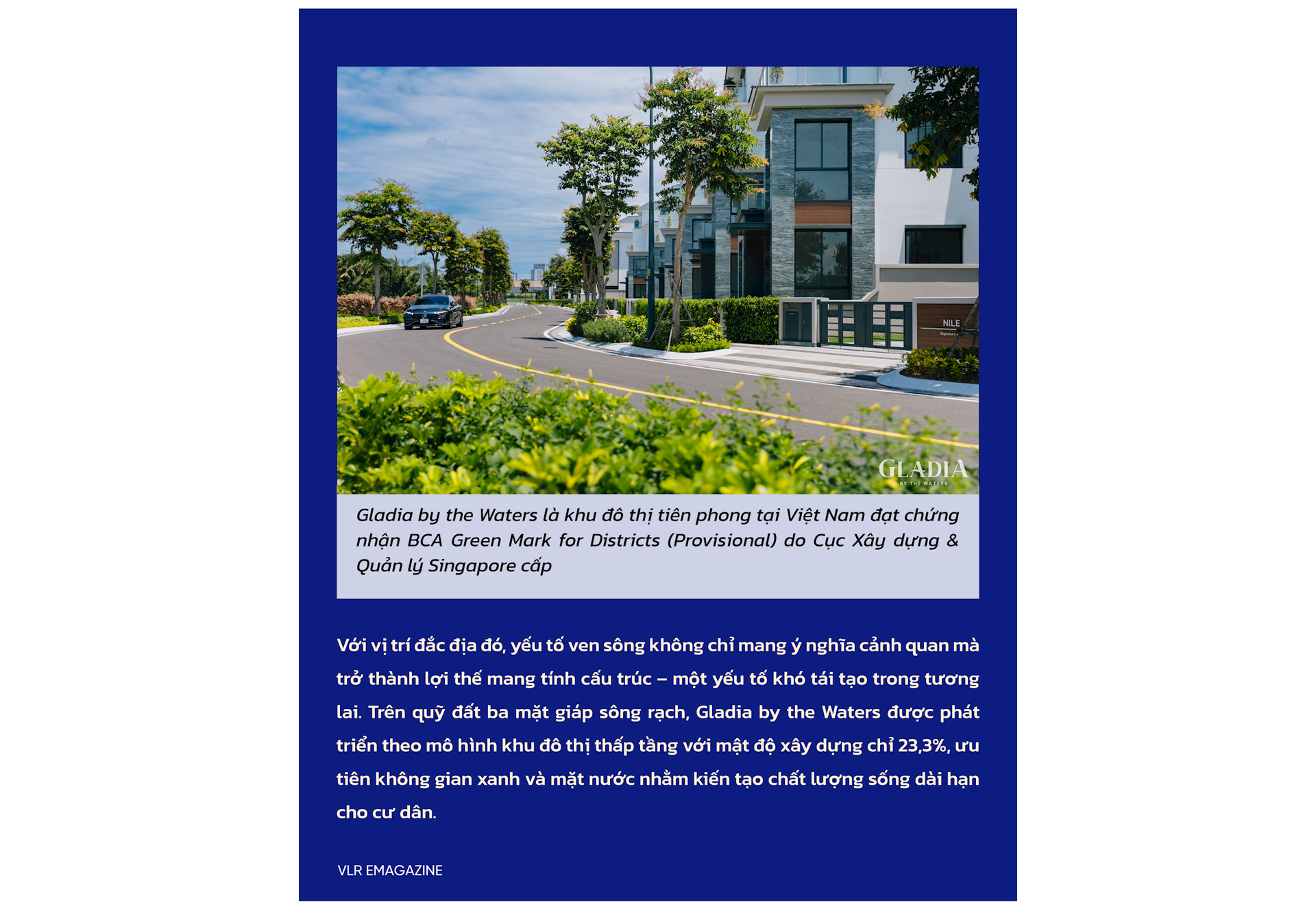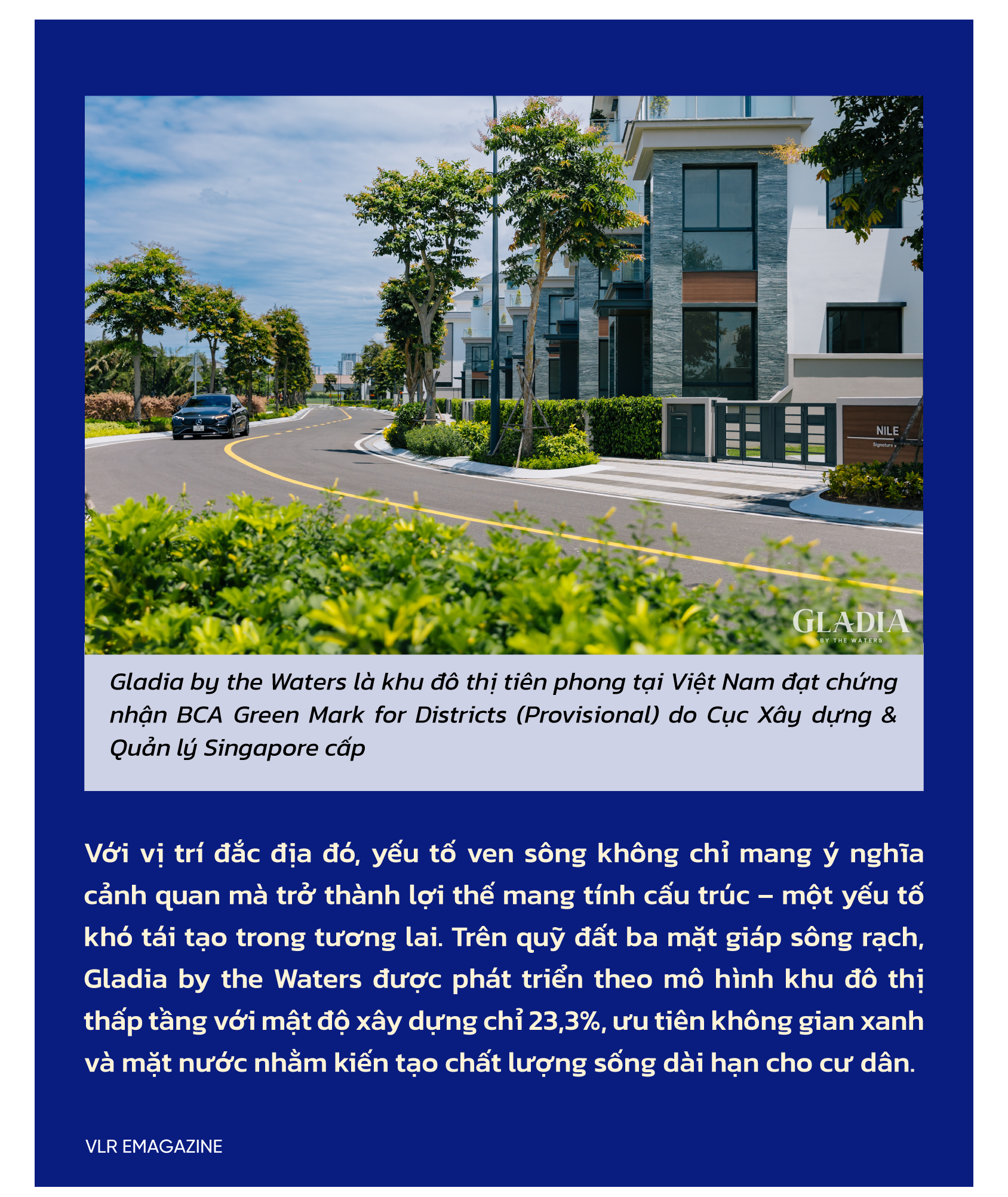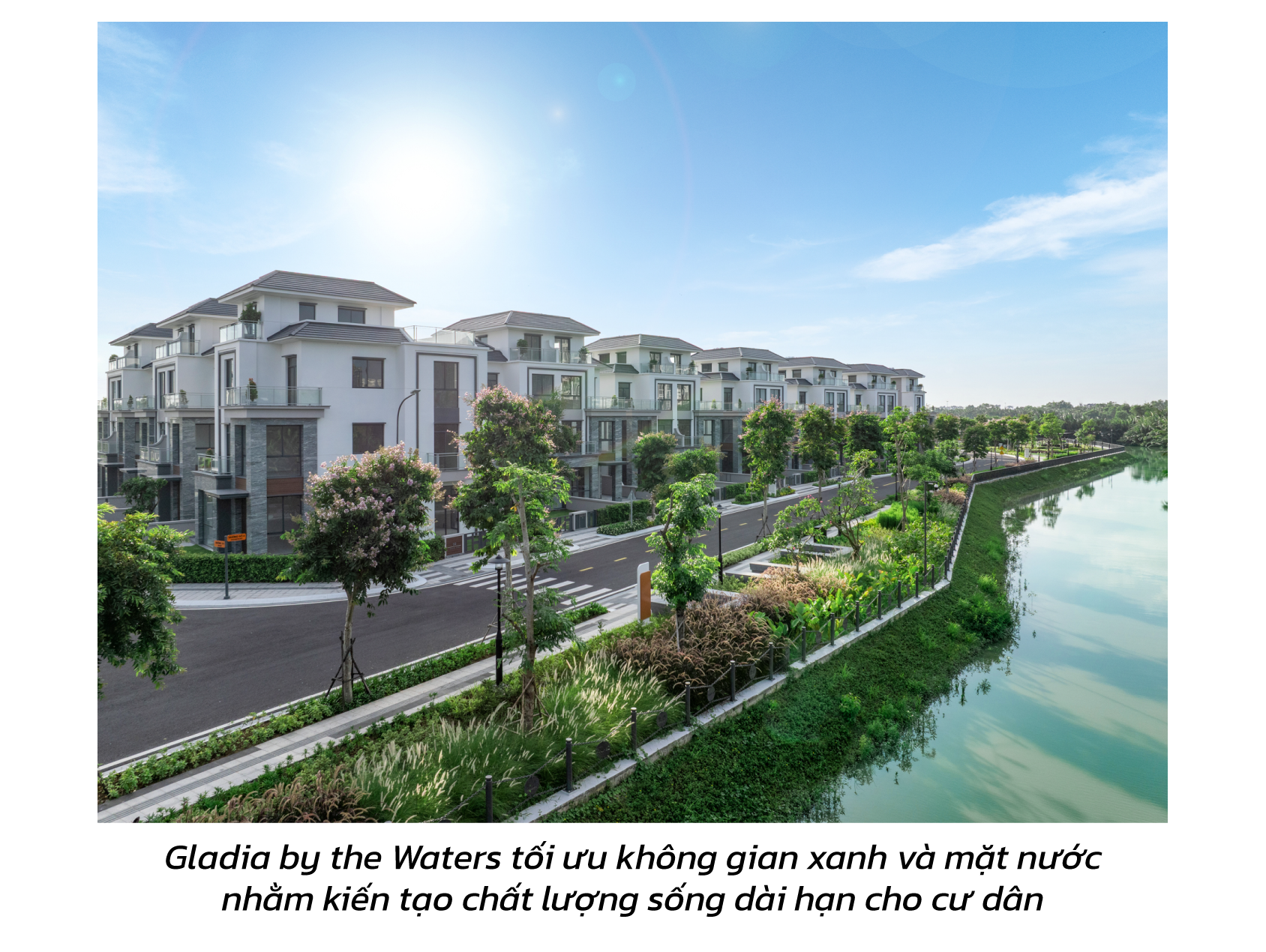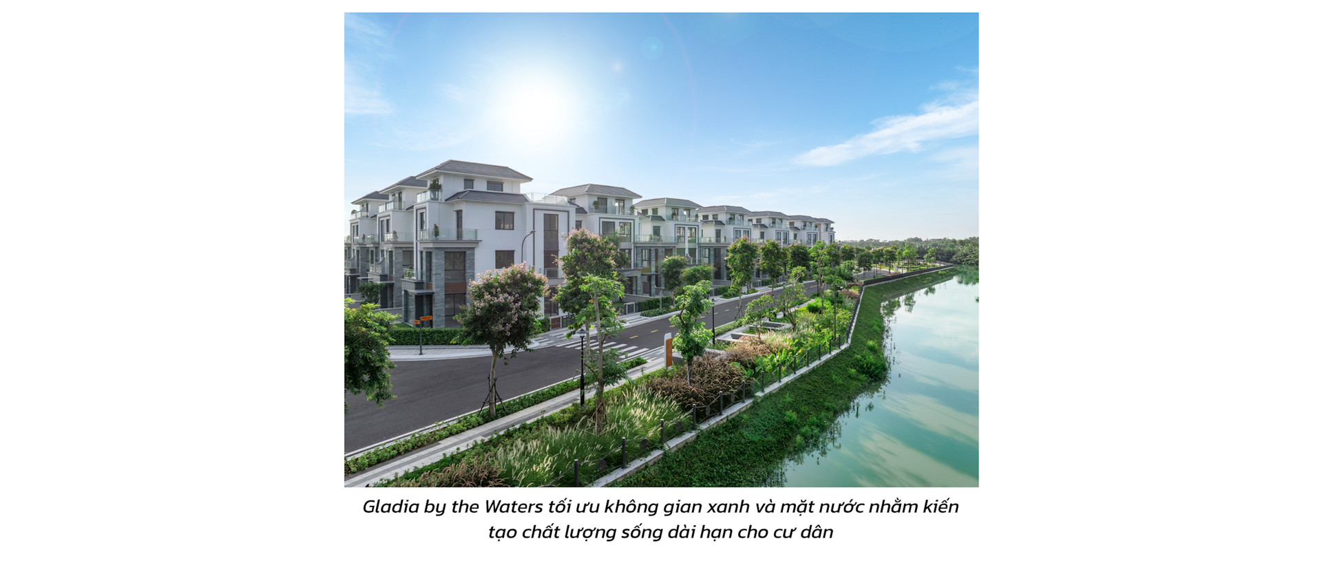 Với vị trí đắc địa đó, yếu tố ven sông không chỉ mang ý nghĩa cảnh quan mà trở thành lợi thế mang tính cấu trúc – một yếu tố khó tái tạo trong tương lai. Trên quỹ đất ba mặt giáp sông rạch, Gladia by the Waters được phát triển theo mô hình khu đô thị thấp tầng với mật độ xây dựng chỉ 23,3%, ưu tiên không gian xanh và mặt nước nhằm kiến tạo chất lượng sống dài hạn cho cư dân.