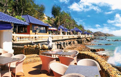 Trái ngược với không gian tĩnh lặng của khu đồi, buổi sáng, vừa mở cửa phòng chúng tôi đã nghe tiếng sóng biển rì rầm và đón nhận ánh nắng mặt trời chiếu lên rực rỡ từ phía biển. Sau phút vùng vẫy với sóng và chạy dài trên cát, du khách sẽ có những phút nghỉ ngơi ăn sáng hoặc uống cà phê ngay giữa khuôn viên sân vườn, vừa thả tầm nhìn ra biển vừa ngắm nhìn những đoàn tàu ra khơi. Ngồi nơi đây, giữa không gian nắng, gió và biển, dưới tán cây xanh râm mát và nhâm nhi những giọt cà phê thơm phức, ít ai có thể lưu giữ trong mình những xung đột nội tâm hoặc lo toan đời thường.