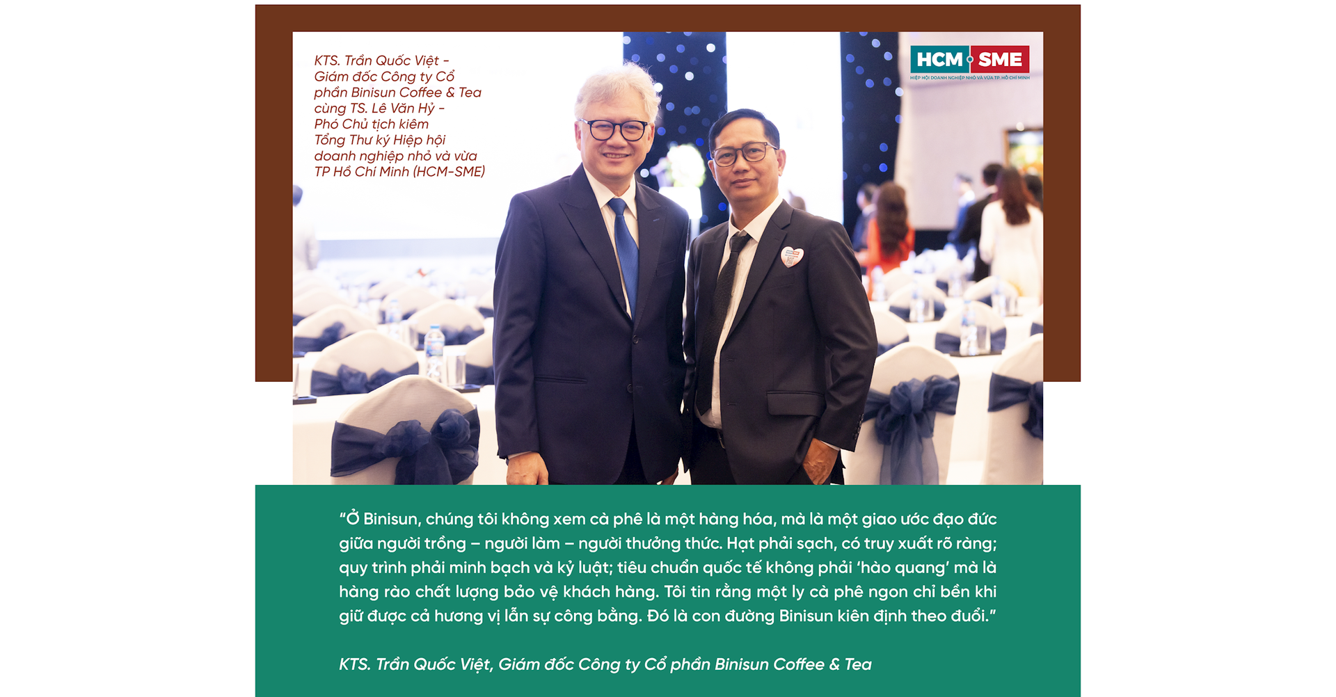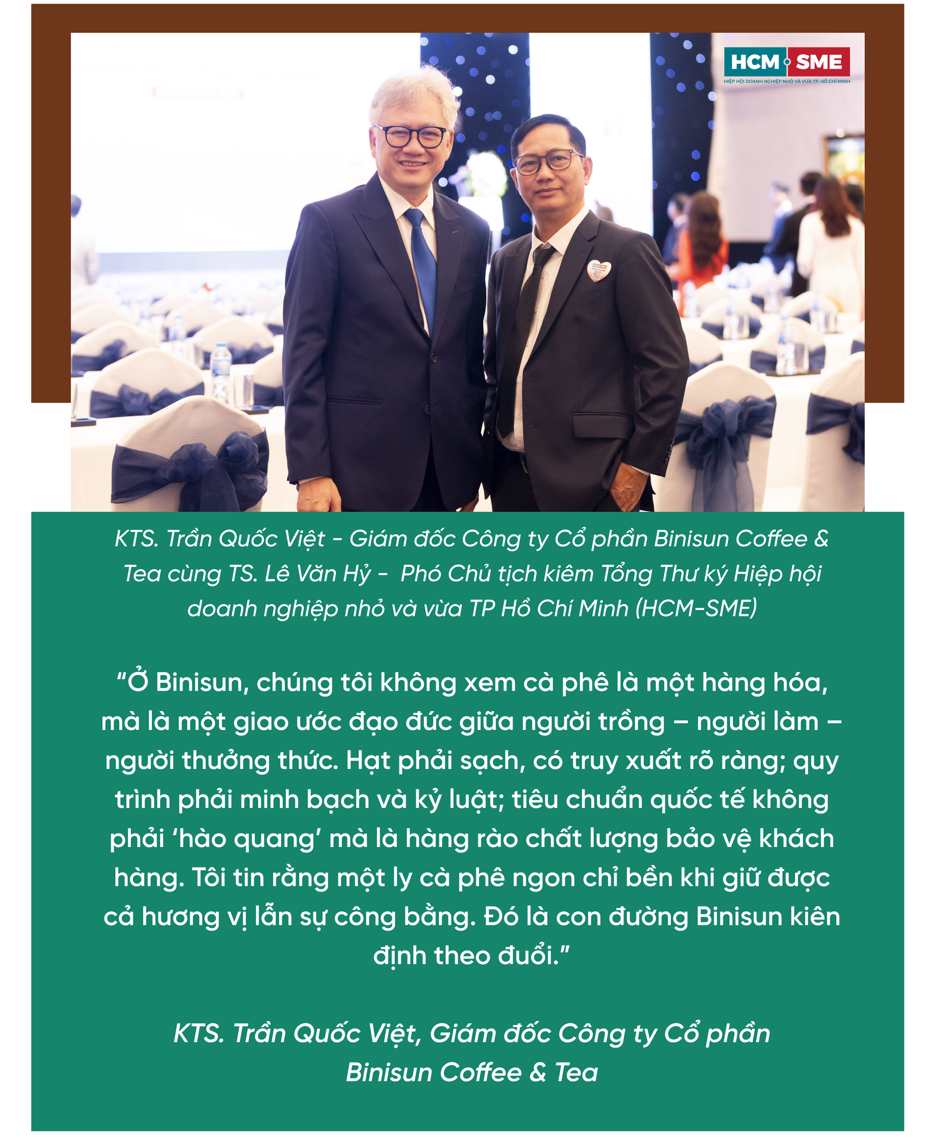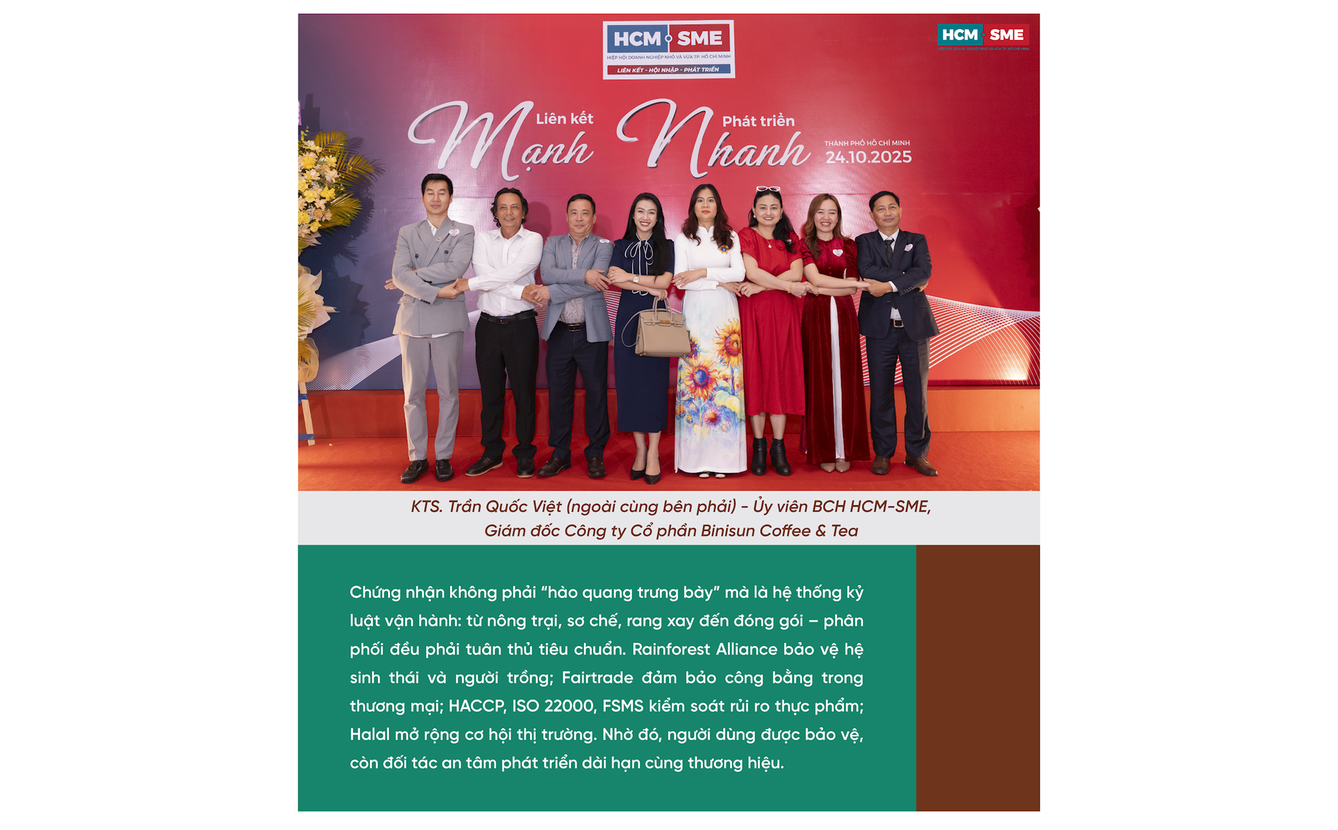 Không chỉ dừng ở sản phẩm, Binisun chủ động hiện diện trong các không gian kết nối kinh doanh – văn hóa. Ngày 25/10/2025, thương hiệu tham gia Ngày hội Doanh nhân Quảng Ngãi: giới thiệu cà phê nguyên chất, chia sẻ kiến thức nhận diện “cà phê sạch”, kết nối nhà phân phối và cộng đồng doanh nhân địa phương. Với thông điệp “Mang hương vị Việt đến mọi nhà”, hoạt động này cho thấy Binisun xem giáo dục thị trường và kết nối đối tác là nhiệm vụ song hành với bán hàng – bởi một ly cà phê ngon cần cả tri thức lẫn hệ sinh thái tiêu dùng văn minh.