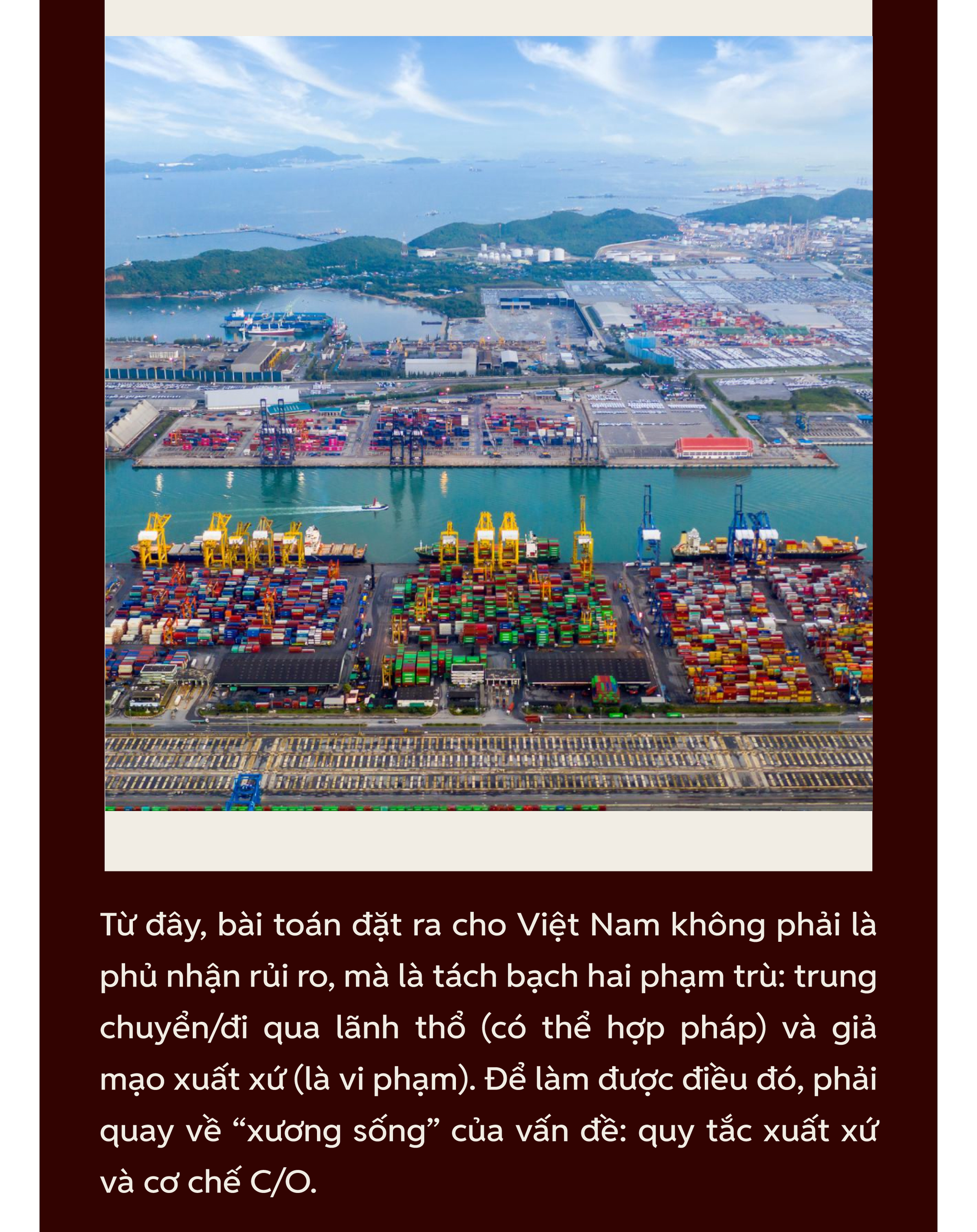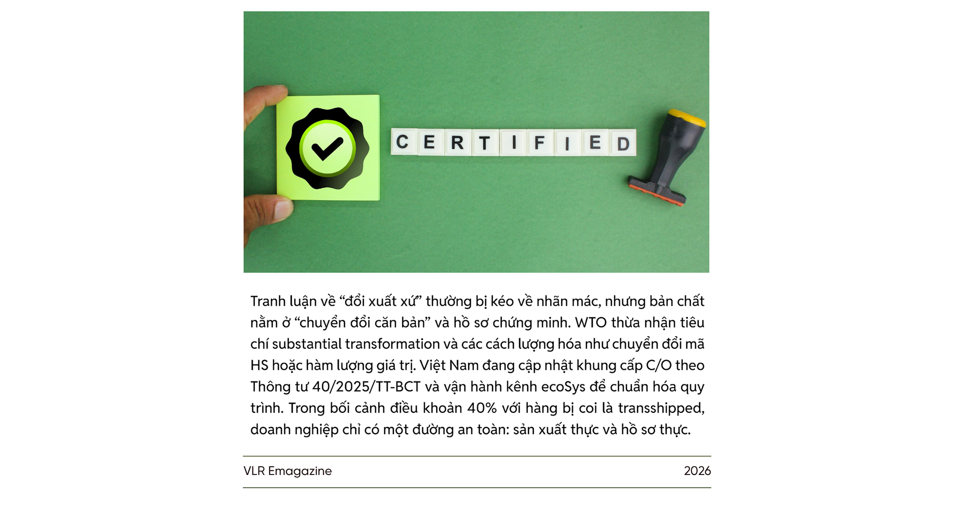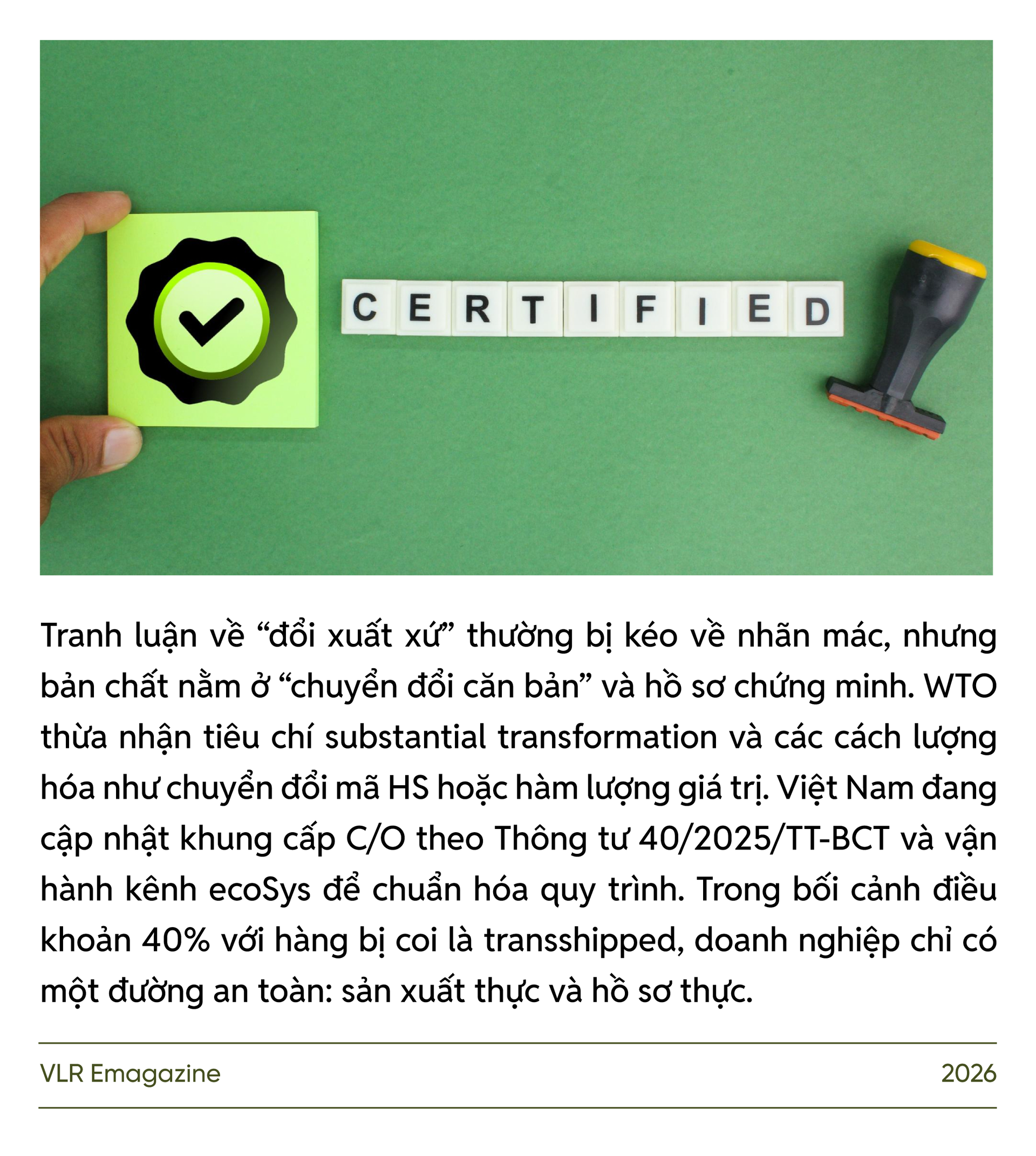 Điều này cũng lý giải vì sao các gói quảng cáo “lo trọn gói C/O” nếu tồn tại ngoài thị trường sẽ luôn là rủi ro lớn cho doanh nghiệp: khi chuỗi kiểm tra chuyển từ “nhìn nhãn” sang “soi hồ sơ và năng lực”, doanh nghiệp yếu nhất ở chỗ nào sẽ lộ ở chỗ đó - từ hóa đơn nguyên liệu, định mức, quy trình sản xuất, đến công suất nhà máy. Và khi rủi ro thuế quan 40% gắn với “transshipment” trở thành một khả năng hiện hữu trong tranh luận chính sách, cái giá của một hồ sơ không vững là cái giá mà doanh nghiệp khó có thể gánh nổi.