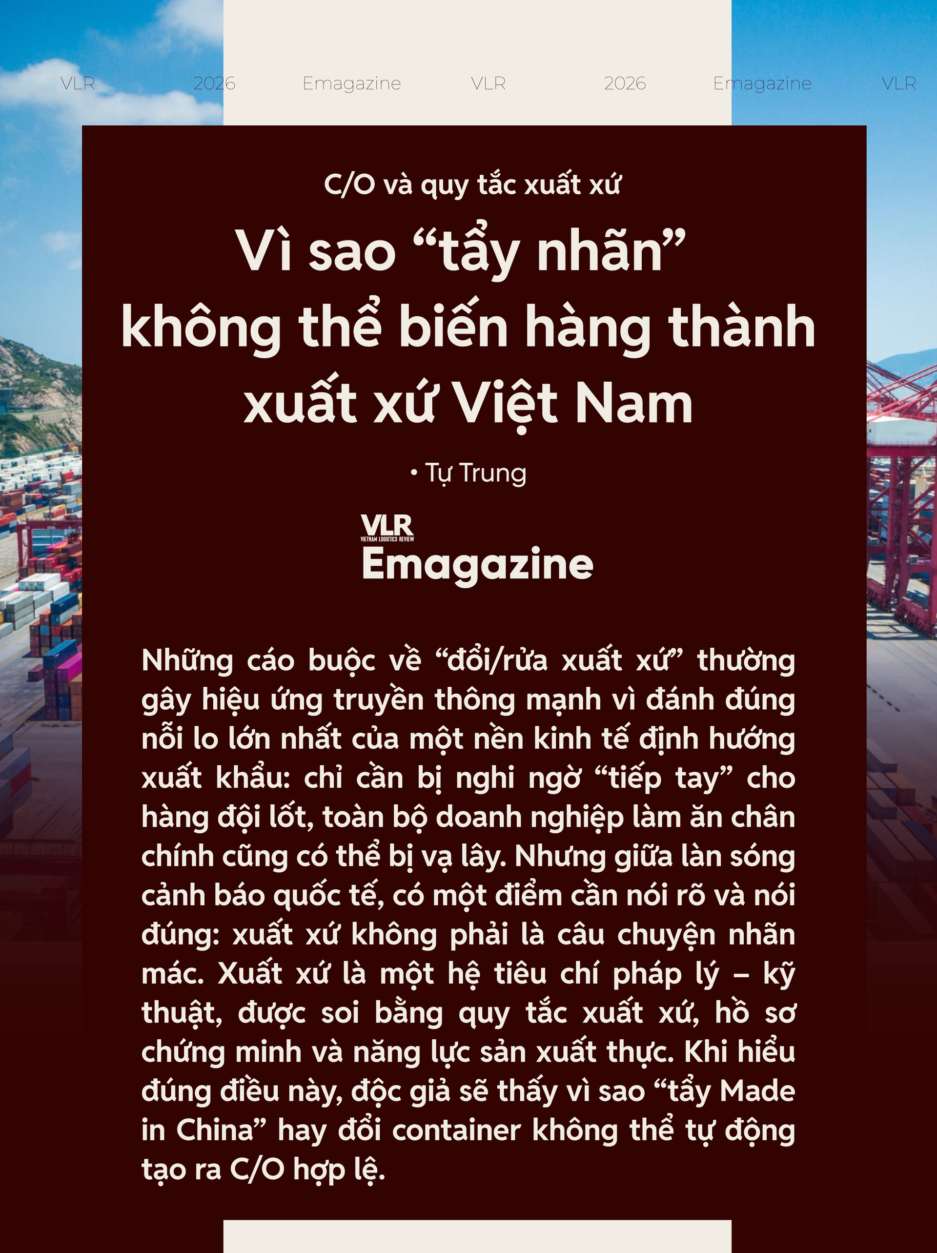 Những cáo buộc về “đổi/rửa xuất xứ” thường gây hiệu ứng truyền thông mạnh vì đánh đúng nỗi lo lớn nhất của một nền kinh tế định hướng xuất khẩu: chỉ cần bị nghi ngờ “tiếp tay” cho hàng đội lốt, toàn bộ doanh nghiệp làm ăn chân chính cũng có thể bị vạ lây. Nhưng giữa làn sóng cảnh báo quốc tế, có một điểm cần nói rõ và nói đúng: xuất xứ không phải là câu chuyện nhãn mác. Xuất xứ là một hệ tiêu chí pháp lý – kỹ thuật, được soi bằng quy tắc xuất xứ, hồ sơ chứng minh và năng lực sản xuất thực. Khi hiểu đúng điều này, độc giả sẽ thấy vì sao “tẩy Made in China” hay đổi container không thể tự động tạo ra C/O hợp lệ.