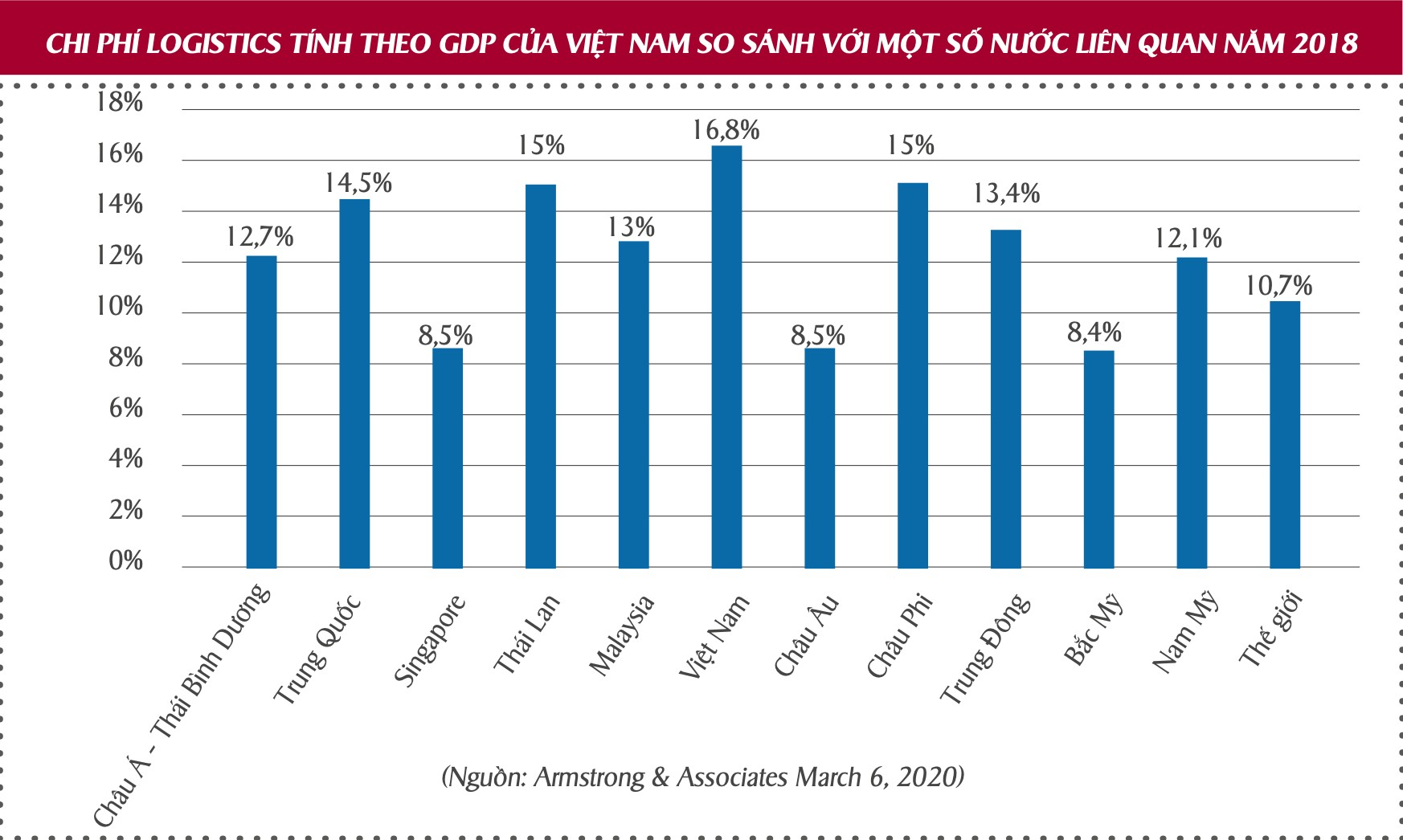 Dựa theo cách tính của ALG, Hiệp hội Doanh nghiệp dịch vụ Logistics Việt Nam (VLA) đã tính toán trên cơ sở cập nhật các dữ liệu theo khối lượng hàng hóa vận chuyển và khối lượng hàng hóa luân chuyển và công bố trong Sách Trắng - VLA 2018 “Chi phí logistics tương đương với GDP của Việt Nam năm 2017 ở mức 14,5% - 19,2%, ước tính chi phí logistics theo GDP là khoảng 16,8%, tương đương với giá trị khoảng 42 tỷ USD”. So sánh với cách tính của NGTK 2018 trên đây thì con số này là đáng tin cậy.
