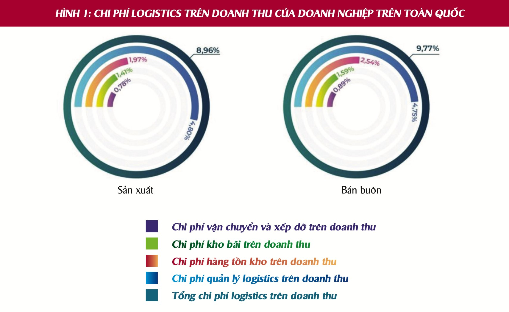 Theo NGTK 2018, chi phí logistics trên doanh thu của DN sản xuất (manufacturing) năm 2018 là 8,96% và trên doanh thu của DN bán buôn (whole sale) là 9,77%. Tỷ lệ này chắc chắn là cải thiện so với 2014. Tỷ lệ % của 4 nhóm cấu thành như Hình 1, trong đó chi phí vận chuyển và xếp dỡ chiếm cao nhất (4,80%/8,96% đối với DN sản xuất và 4,75%/9,77% đối với DN bán buôn), tiếp đến là chi phí hàng tồn kho 1,97% và 2,54%, chi phí kho bãi 1,41% và 1,59% và cuối cùng là chi phí quản lý logistics 0,78% và 0,89%.
