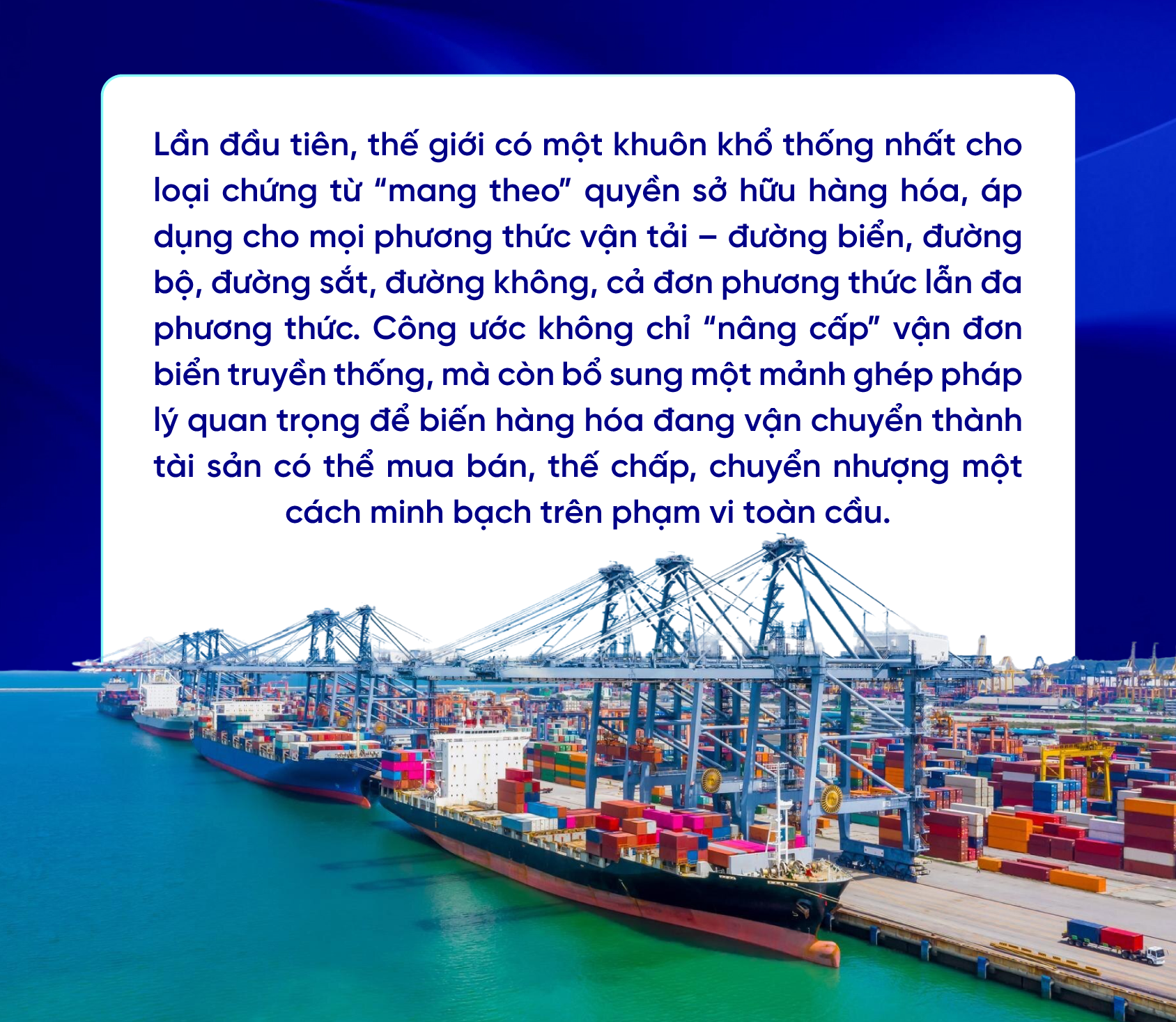 Trong nhiều thập kỷ, vận đơn đường biển là ngôi sao gần như duy nhất trong “vũ trụ” chứng từ chuyển nhượng. Đây là loại chứng từ được công nhận là document of title – ai đang cầm vận đơn hợp lệ thì người đó có quyền nhận hàng, bán lại hàng hoặc dùng hàng làm tài sản bảo đảm. Nhưng lợi thế ấy gần như chỉ dành cho hàng đi bằng đường biển. Hàng đi bằng xe tải, tàu hỏa hay máy bay phần lớn được ghi nhận bằng các loại vận đơn, phiếu gửi không chuyển nhượng, nên khó được ngân hàng chấp nhận làm tài sản bảo đảm; việc bán lại hàng đang vận chuyển cũng thường phải xử lý bằng hợp đồng, phụ lục phức tạp, thiếu một nền tảng pháp lý thống nhất.