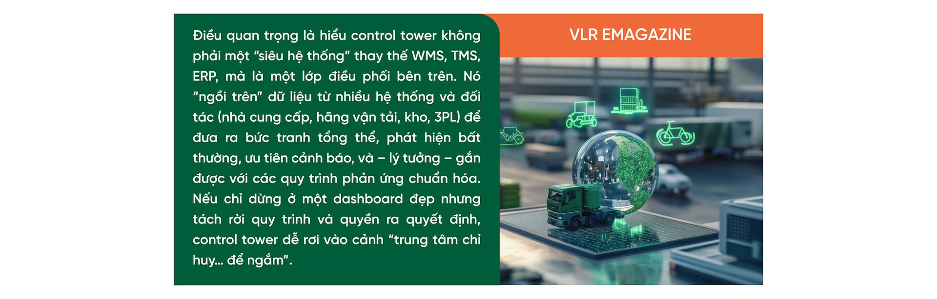 Với doanh nghiệp Việt Nam, đặc biệt là những đơn vị vừa và lớn có nhiều nhà máy, kho, thị trường, câu hỏi không nên là “mua control tower của hãng nào”, mà là “mình đang thiếu gì trong ba trụ cột: nhìn thấy – phân tích – điều phối”. Có doanh nghiệp thiếu dữ liệu cơ bản về tồn kho đa điểm; có nơi lại dư dữ liệu nhưng thiếu cơ chế ra quyết định liên phòng ban khi có cảnh báo. Control tower tốt nhất là cái giải đúng bài toán cụ thể, chứ không phải bản sao của mô hình “tây đang dùng”.