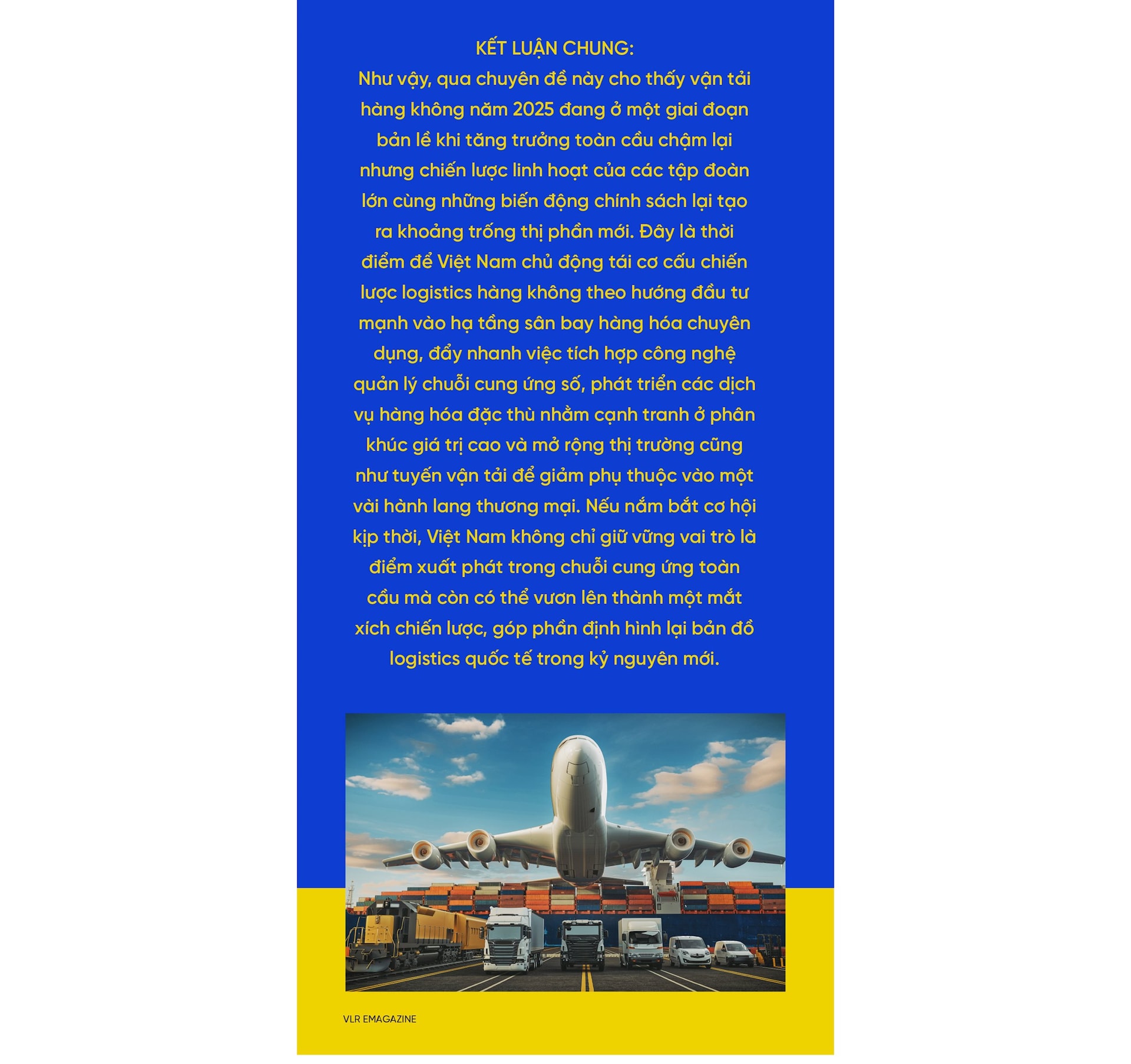Điều này đòi hỏi chiến lược dài hạn: đầu tư vào sân bay hàng hóa chuyên biệt, phát triển đội bay chuyên dụng trong nước, mở rộng dịch vụ hậu cần lạnh và kết nối đường sắt – đường biển với đường hàng không để hình thành các hành lang logistics tích hợp.