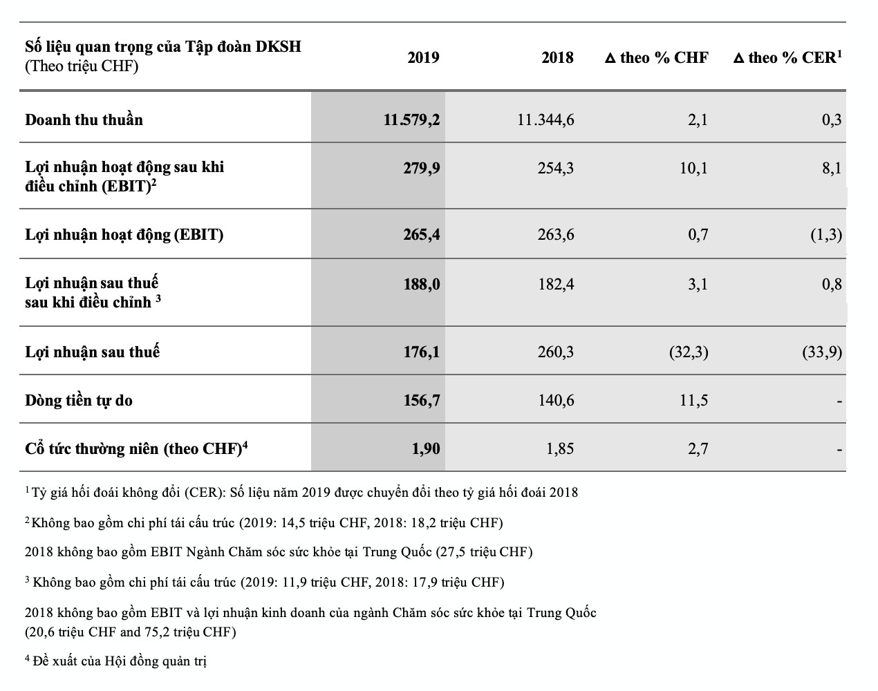 Doanh thu thuần tăng 2,1% đạt mức 11.6 tỷ CHF và EBIT tăng 0,7% đạt mức 265,4 triệu CHF. Doanh thu thuần và EBIT tăng lần lượt 6,7% và 10,1%, sau khi đã trừ ra phần lợi nhuận từ ngành Chăm sóc sức khỏe tại Trung Quốc và chi phí tái cấu trúc. Do đó, mức lợi nhuận trước thuế (EBIT) sau khi được điều chỉnh cũng đã tăng nhẹ. Ngoài ra, DKSH đã thực hiện thành công bốn thương vụ mua lại và tiếp tục chính sách cổ tức lũy tiến. Sau khi thông qua kết quả tài chính năm 2019 và cơ hội đầu tư, Hội đồng quản trị đề xuất mức cổ tức thường niên cao hơn là 1,90 CHF trên mỗi cổ phiếu (+ 2,7%).
