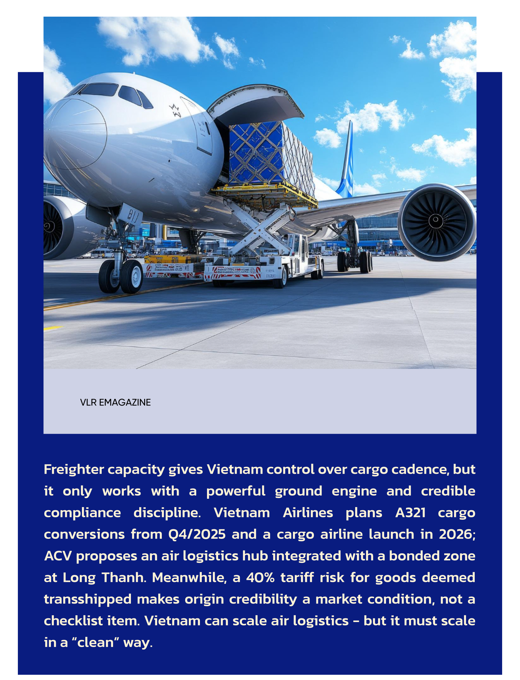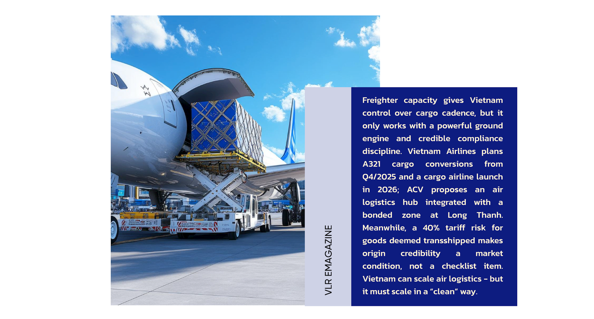 Closes the series with a clear message: Vietnam has a window of opportunity as international demand grows and supply chains search for stable transport networks. But opportunity turns into advantage only if Vietnam builds the right structure: freighters provide dynamic lift, Long Thanh (and key airports) provide FTZ/logistics processing capacity, and origin compliance provides the credibility needed to expand networks. When these three layers move in sync, Vietnam increases not only tonnage, but also strategic position in regional supply chains.