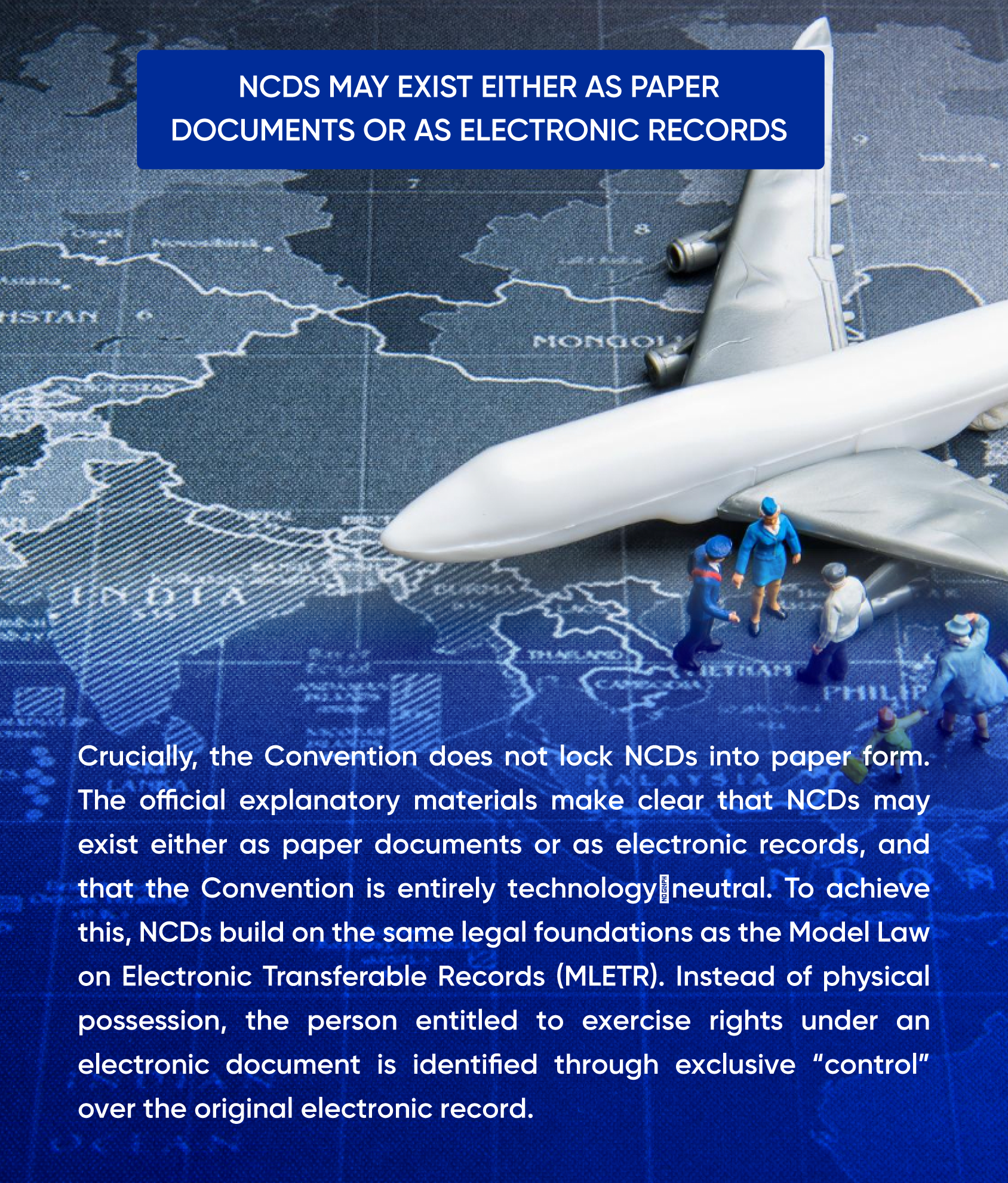 The NCD Convention aims to extend the concept of a document of title to all modes of transport. According to UNCITRAL, NCDs enable goods carried by ship, train, truck or aircraft – whether under unimodal or multimodal arrangements – to be resold, pledged as security or have their ownership transferred simply through the transfer of the document. In substance, transferring an NCD has the same legal effect as handing over the goods themselves, in terms of the rights attached to the shipment.