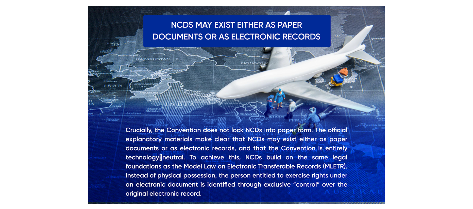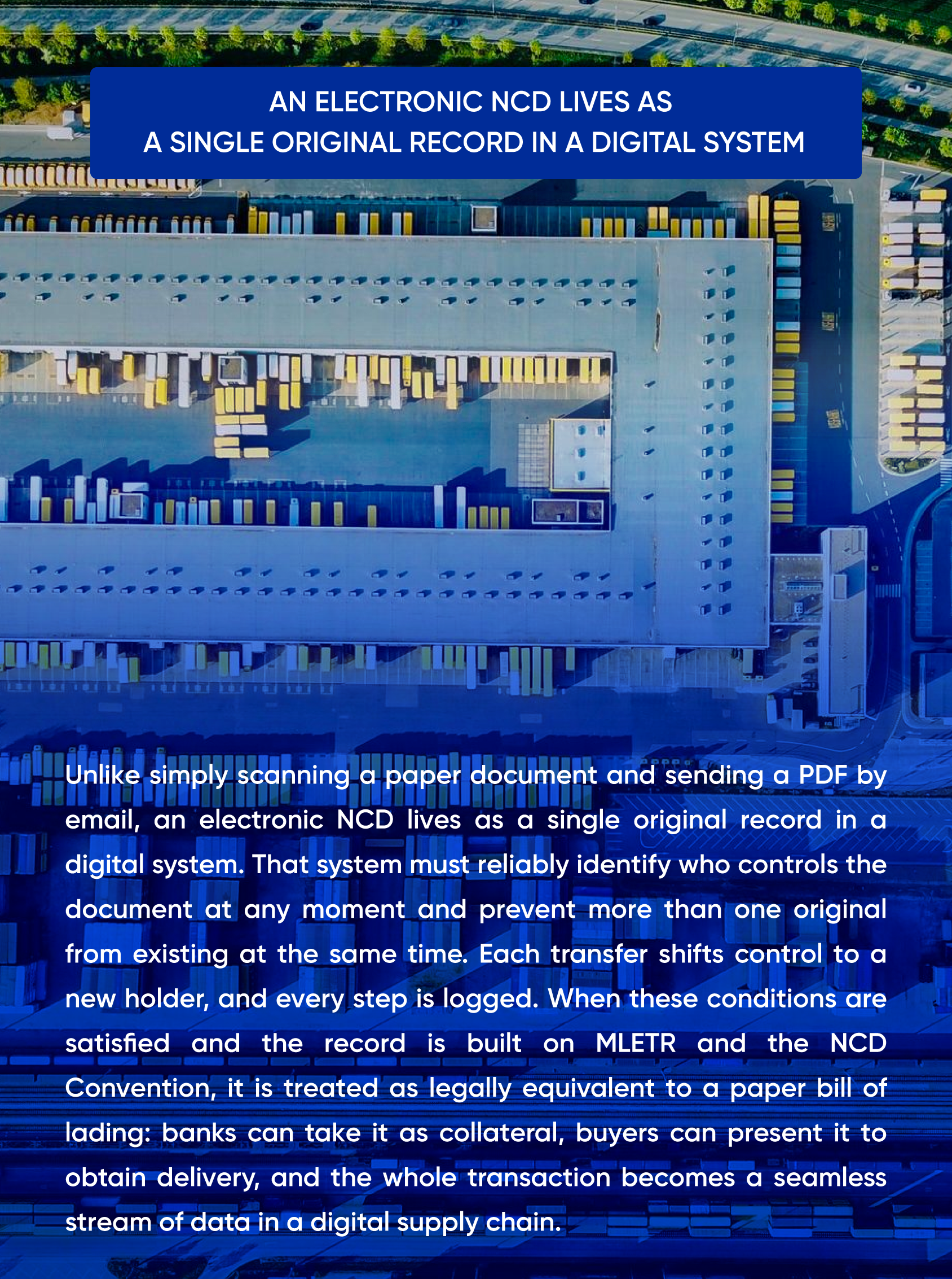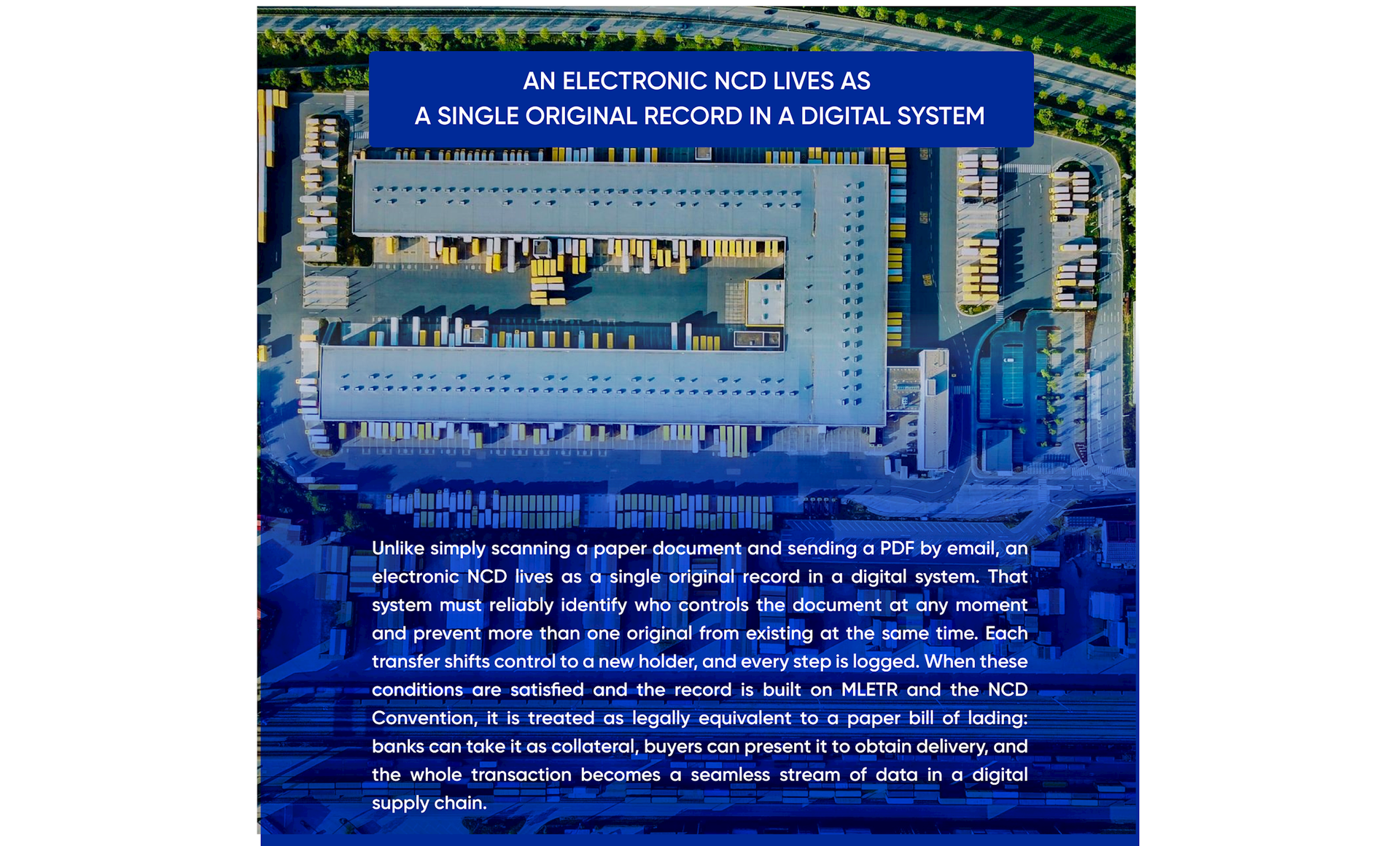Unlike simply scanning a paper document and sending a PDF by email, an electronic NCD lives as a single original record in a digital system. That system must reliably identify who controls the document at any moment and prevent more than one original from existing at the same time. Each transfer shifts control to a new holder, and every step is logged. When these conditions are satisfied and the record is built on MLETR and the NCD Convention, it is treated as legally equivalent to a paper bill of lading: banks can take it as collateral, buyers can present it to obtain delivery, and the whole transaction becomes a seamless stream of data in a digital supply chain. |