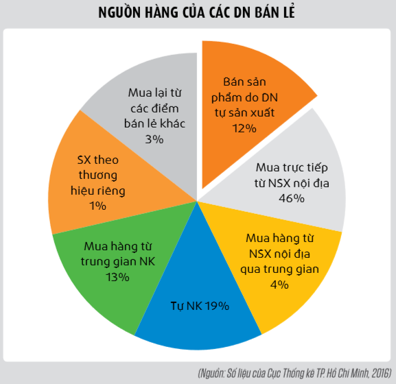 Theo số liệu của Cục Thống kê TP. HCM, năm 2016, trong số 7 nguồn cung phổ biến với ngành bán lẻ, nguồn hàng mua trực tiếp từ nhà sản xuất nội địa chiếm vị trí lớn nhất, trung bình chiếm tới 46% tổng nguồn hàng của các DN. Nguồn hàng từ chính DN vừa là nhà sản xuất đồng thời có các cơ sở bán lẻ sản phẩm do họ sản xuất lại khiêm tốn hơn, khoảng 12%. Trung bình có khoảng 4% nguồn hàng được mua từ các nhà sản xuất nhưng thông qua các kênh trung gian. Số nhà bán lẻ bán hàng mang thương hiệu riêng của mình rất ít, chỉ chiếm chưa đầy 1% tổng nguồn hàng, họ là những nhà bán lẻ đặt hàng các đơn vị sản xuất để gia công hàng hóa mang thương hiệu của mình. Nhìn chung, trừ các nguồn khác không xác định (khoảng 5%), nguồn hàng nội địa hiện chiếm khoảng 60% tổng nguồn hàng của các DN. Số DN bán hàng hóa mang thương hiệu riêng của mình (thuê các đơn vị sản xuất gia công) chiếm tỷ lệ rất nhỏ, chưa đầy 1%.