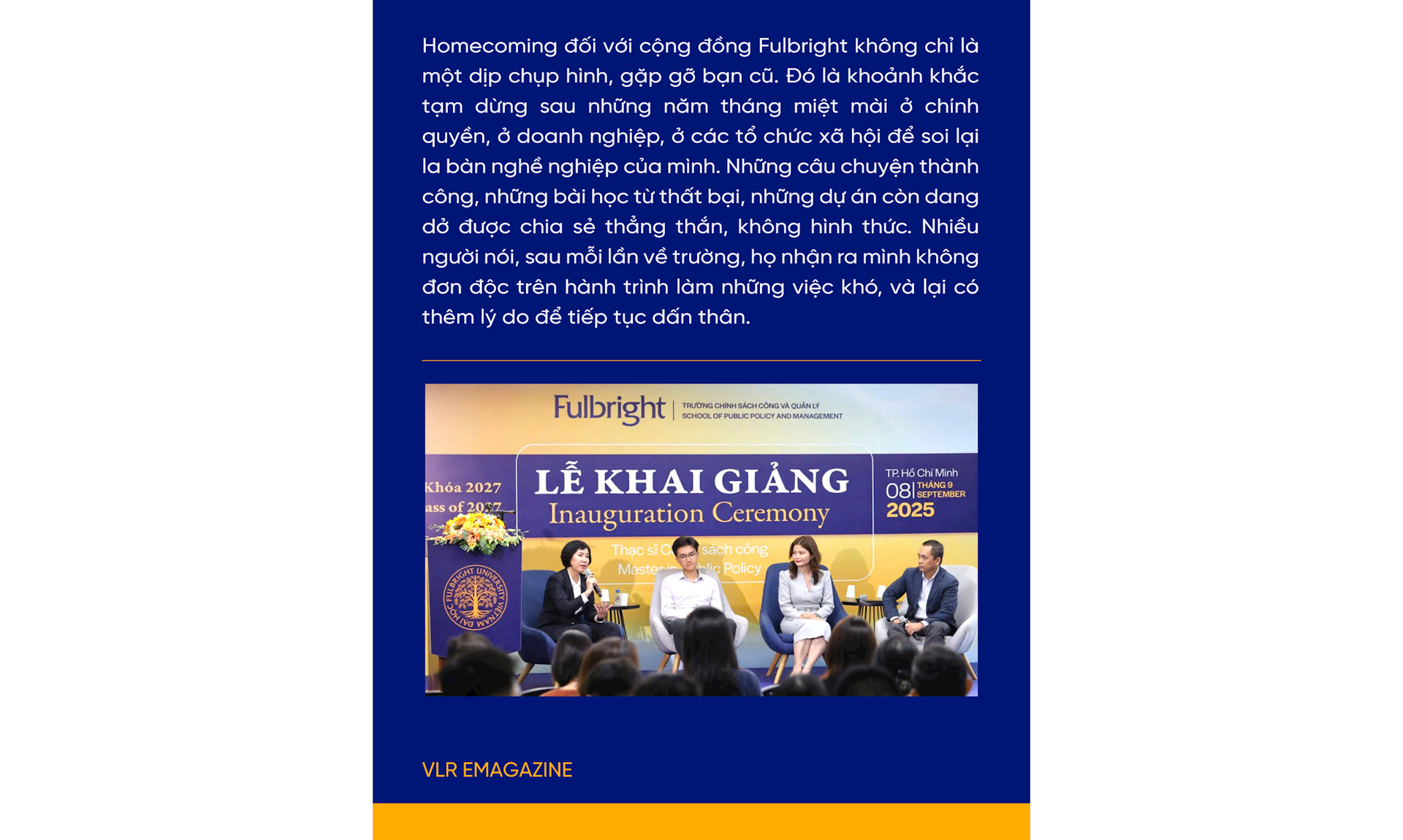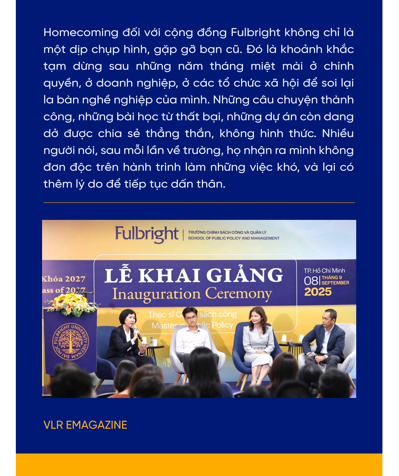 Ba mươi năm trước, Fulbright bắt đầu từ một lớp học nhỏ trong con hẻm Sài Gòn. Ba mươi năm sau, đó là một cộng đồng rộng lớn, đa ngành, đa thế hệ, cùng chia sẻ lý tưởng dùng tri thức để phụng sự. Và câu chuyện ấy rõ ràng chưa dừng lại; Homecoming 2025 chỉ là một dấu phẩy trong bản trường ca dài. Từ “Ngày về nhà” hôm nay, những cuộc chia tay ở cổng trường cũng là những chuyến lên đường mới - để rồi lại có một ngày khác, tất cả cùng hẹn nhau… trở về.