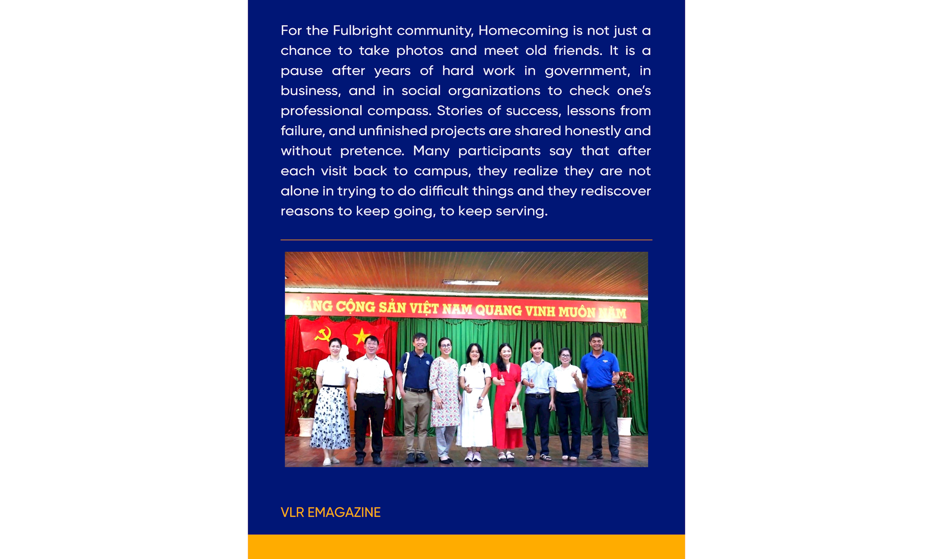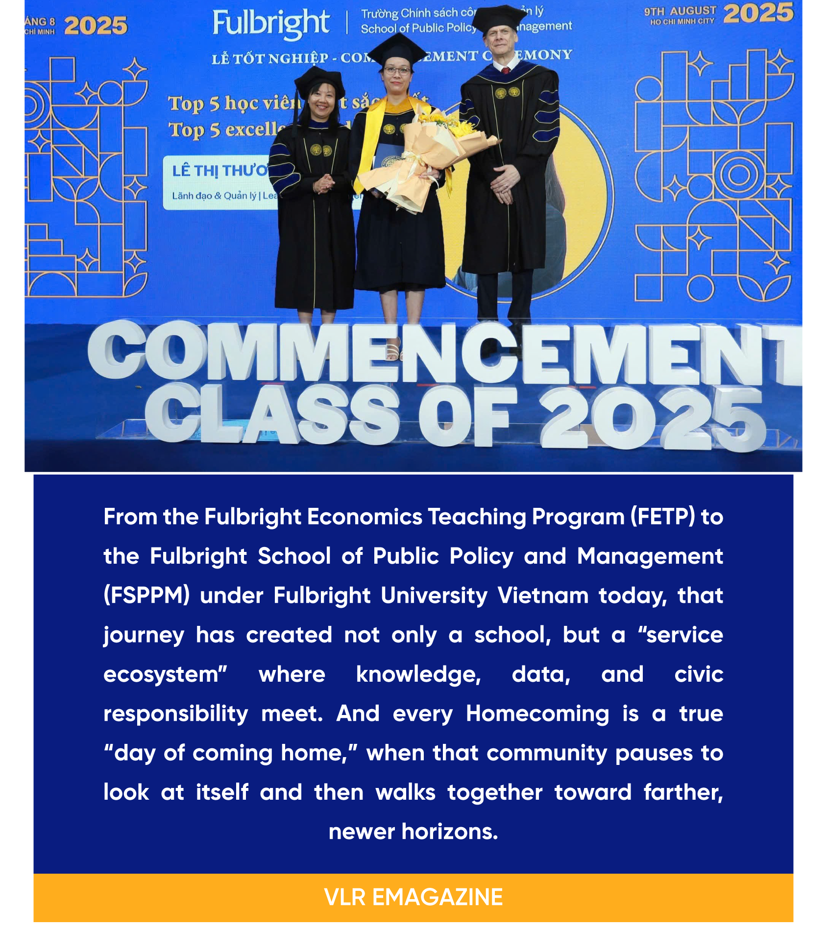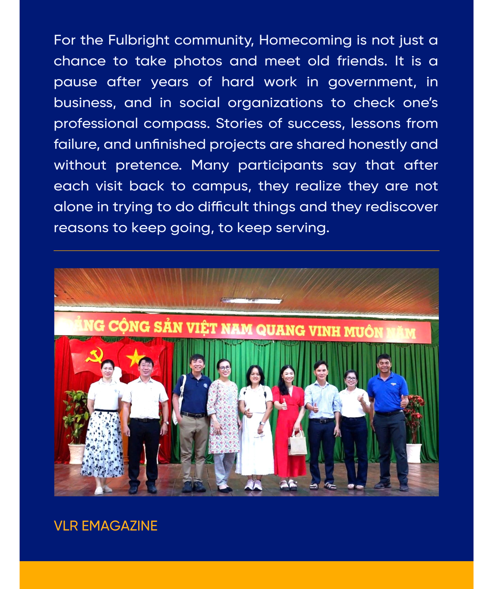 Thirty years ago, Fulbright began in a small classroom in a Saigon alley. Thirty years later, it is a large, diverse, multi-generational community sharing the same ideal of using knowledge in the service of others. The story is clearly far from over; Homecoming 2025 is just a comma in a much longer symphony. From this “day of coming home,” goodbyes at the campus gate are also new departures - so that one day, somewhere down the road, everyone will again have a reason to return.