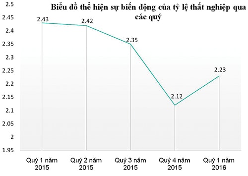 Tỷ lệ thất nghiệp của lao động trong độ tuổi có xu hướng tăng, cụ thể: Quý IV.2015 là 2,12%, và tỷ lệ thất nghiệp trong độ tuổi quý I.2016 ước tính là 2,23%.