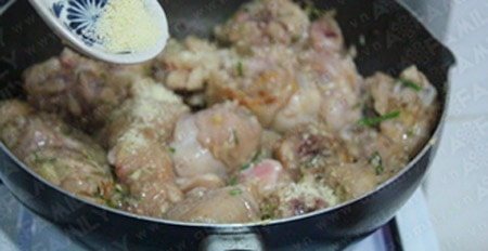 Nêm 1 muỗng canh hạt nêm, đảo đều thịt gà, đun 2 phút.