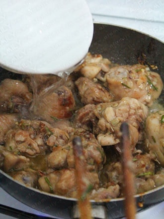 Cho 1 bát nước lọc (hoặc nếu có nước dùng gà thì ngon hơn) vào chảo, đun đến khi thịt gà chín mềm là được.