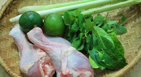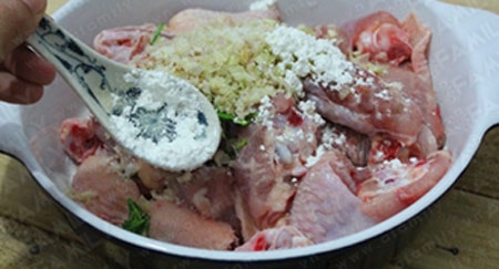 Ướp gà với lá chanh, sả bằm, 1 muỗng canh nước cốt chanh, 1 muỗng canh đường, 1 muỗng canh nước mắm, 1 muỗng canh bột bắp trong 20 phút cho ngấm.