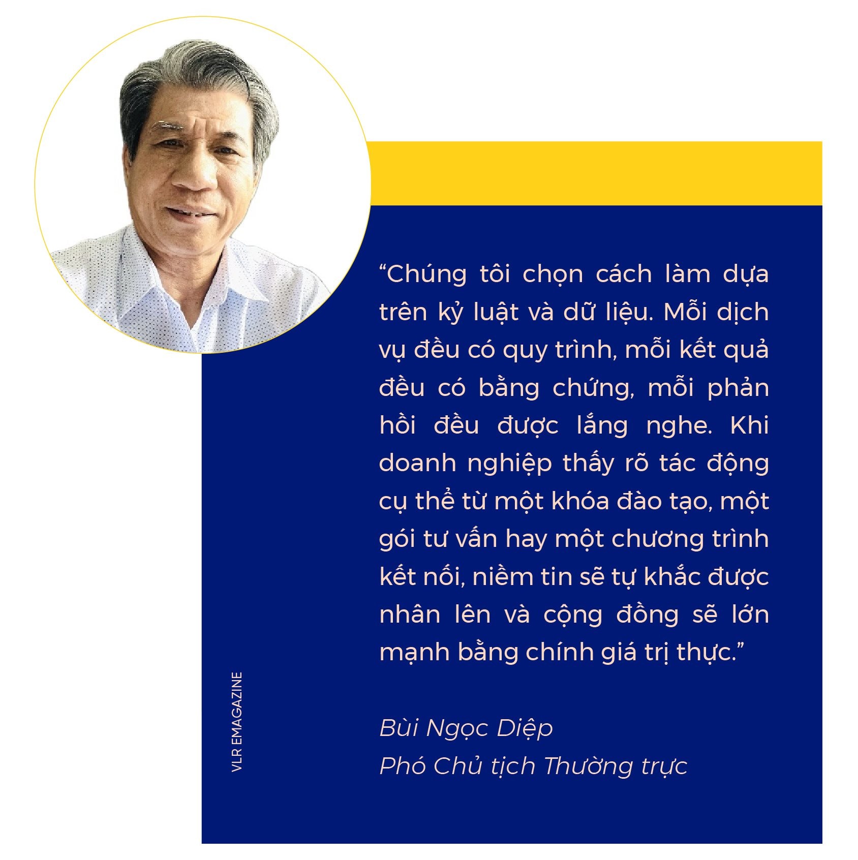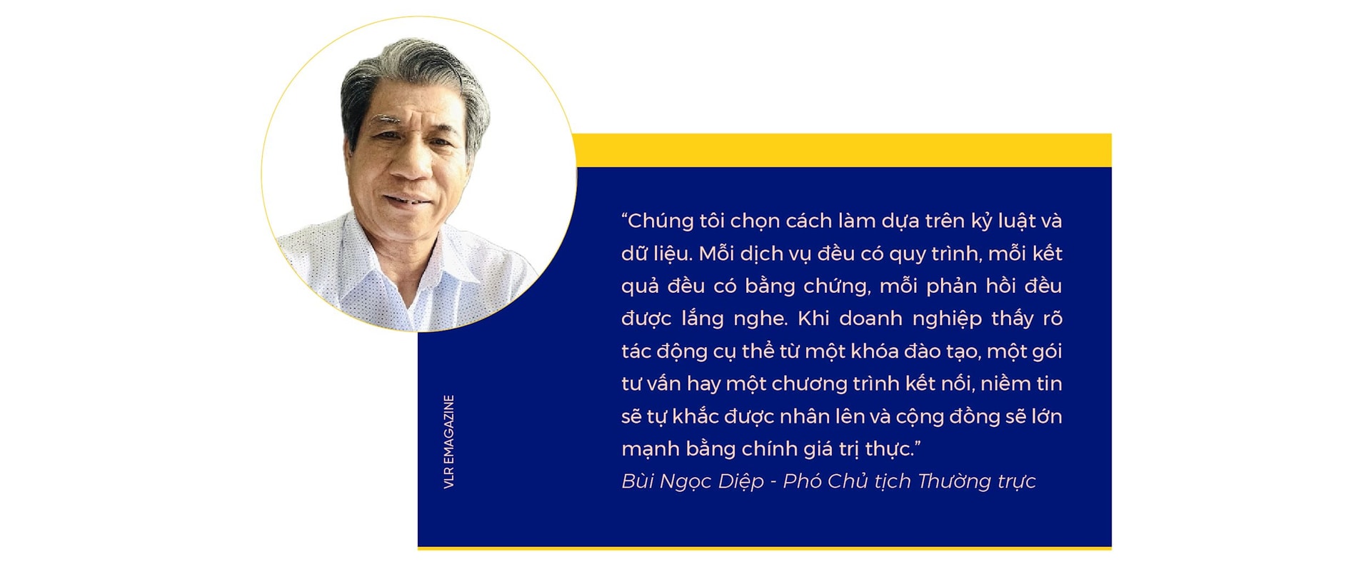 Phó Chủ tịch Thường trực Bùi Ngọc Diệp nhấn mạnh: muốn chương trình “chạm” đến doanh nghiệp, cần một văn hóa hợp tác thực chất. Các trung tâm dịch vụ theo cụm ngành sẽ là “đầu mối một cửa” để doanh nghiệp tiếp cận đào tạo, tư vấn, tiêu chuẩn, xúc tiến và kết nối tài chính. Ở những ngành có yêu cầu kỹ thuật cao, Hiệp hội sẽ xây dựng mạng lưới cố vấn chuyên sâu, liên kết với các viện – trường và tổ chức chứng nhận, bảo đảm dịch vụ theo đúng chuẩn mực quốc tế nhưng chi phí phù hợp.