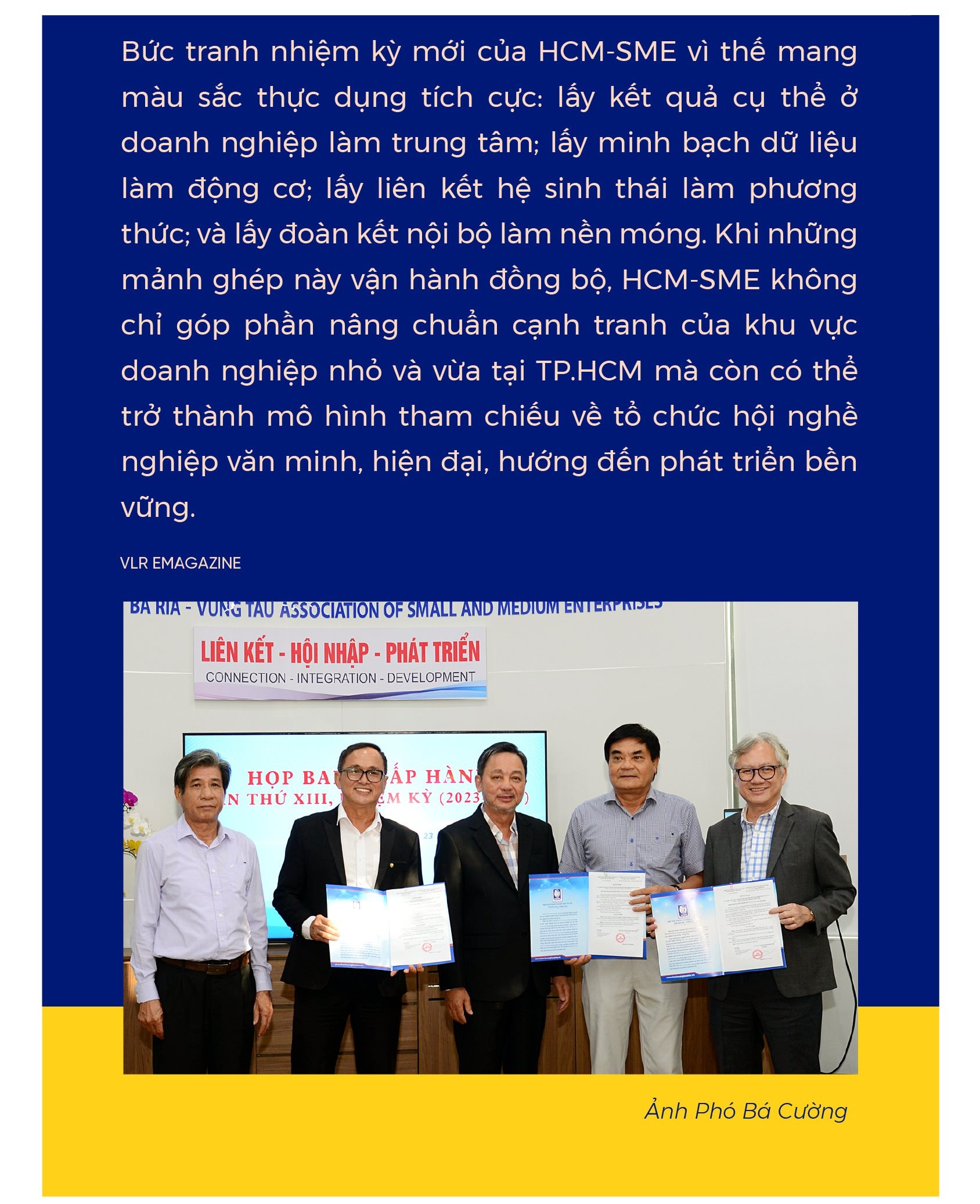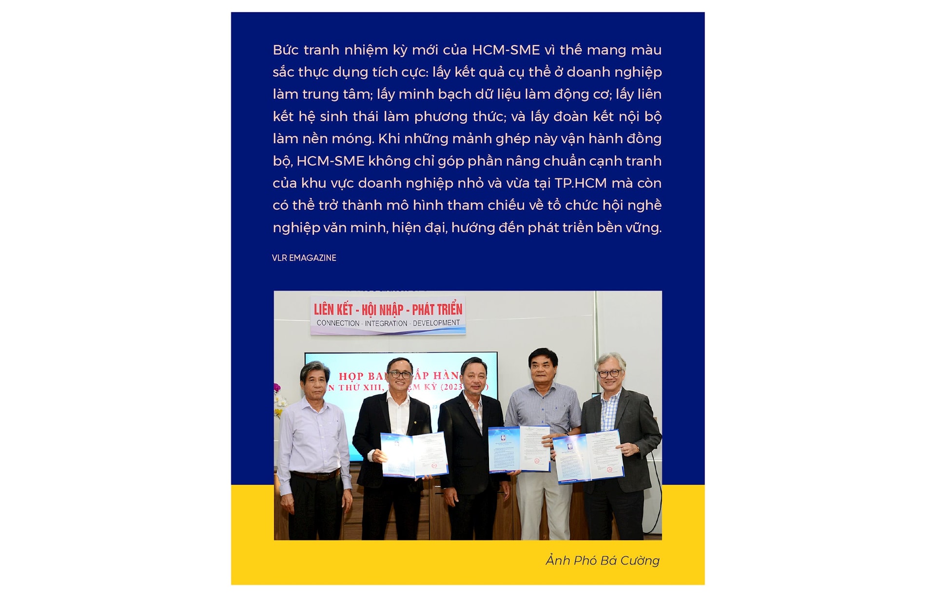 Ba là, mở rộng thị trường dựa trên năng lực số và liên kết ngành. Hiệp hội sẽ nghiên cứu tổ chức các nhóm xúc tiến theo cụm sản phẩm, tập trung vào những thị trường có lợi thế tiếp cận và tận dụng các hiệp định thương mại tự do. Song song, HCM-SME thúc đẩy hình thành các cụm liên kết ngành – nơi doanh nghiệp trong cùng chuỗi giá trị chia sẻ tiêu chuẩn, kết nối cung – cầu, đồng phát triển giải pháp công nghệ và các mô hình tài chính chuỗi. Ở cấp vi mô, mỗi câu lạc bộ ngành là một “điểm chạm” giải quyết bài toán cụ thể của doanh nghiệp; ở cấp vĩ mô, các sở, ngành của Thành phố là đối tác đồng hành trong hoàn thiện môi trường kinh doanh.