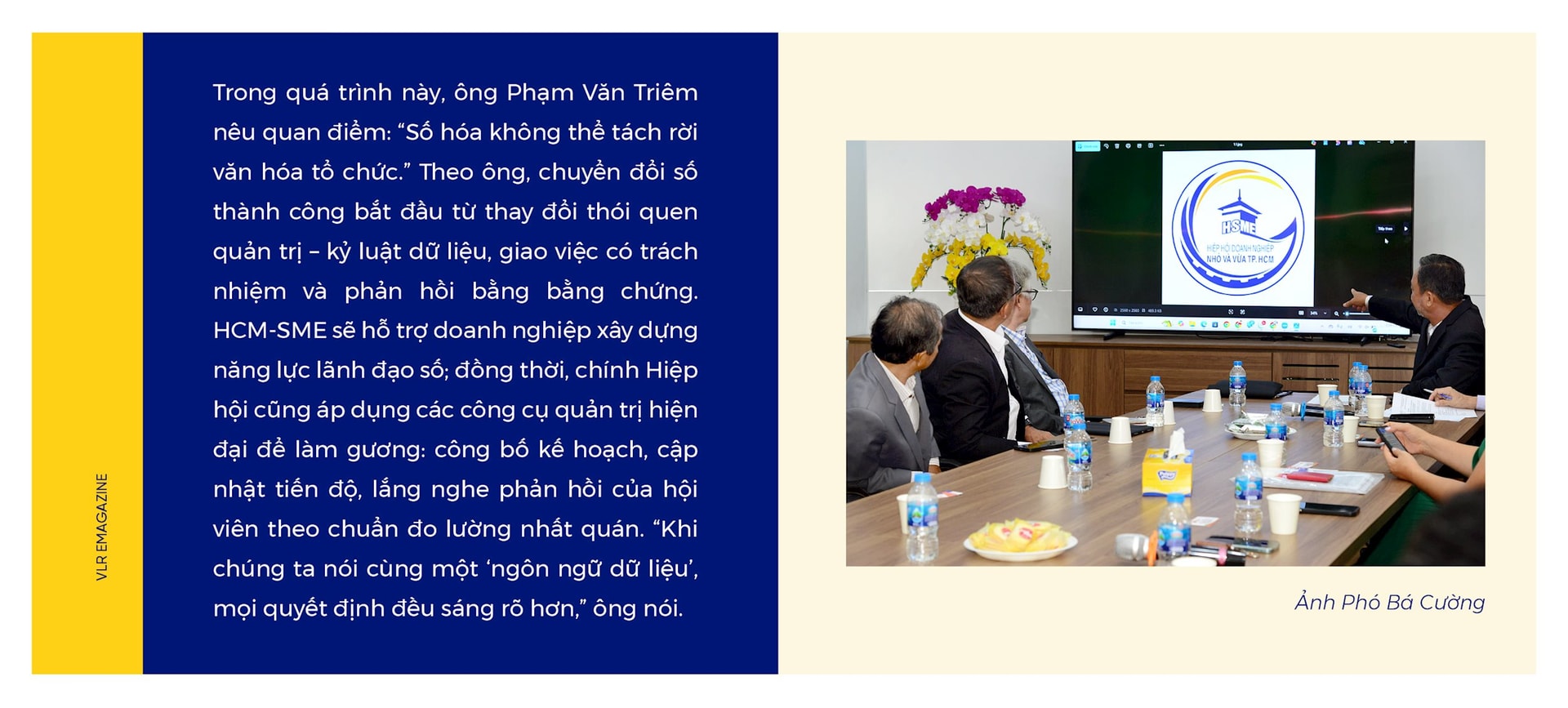 HCM-SME định vị ba hướng đi xuyên suốt. Một là, số hóa thực chất, bắt đầu từ nền tảng hội viên điện tử làm hạ tầng quản trị và tương tác. Đây không chỉ là kho dữ liệu tập trung mà còn là “cửa ngõ” để doanh nghiệp tiếp cận đào tạo trực tuyến, tư vấn chuyên gia, thư viện pháp lý và các công cụ đo lường mức độ trưởng thành số. Hiệp hội ưu tiên các mô-đun thiết yếu, dễ áp dụng, phù hợp đặc thù doanh nghiệp nhỏ và vừa, đồng thời phát động chương trình an toàn thông tin và kế hoạch liên tục kinh doanh để gia cố “lá chắn số” trước các rủi ro ngày càng phức tạp.