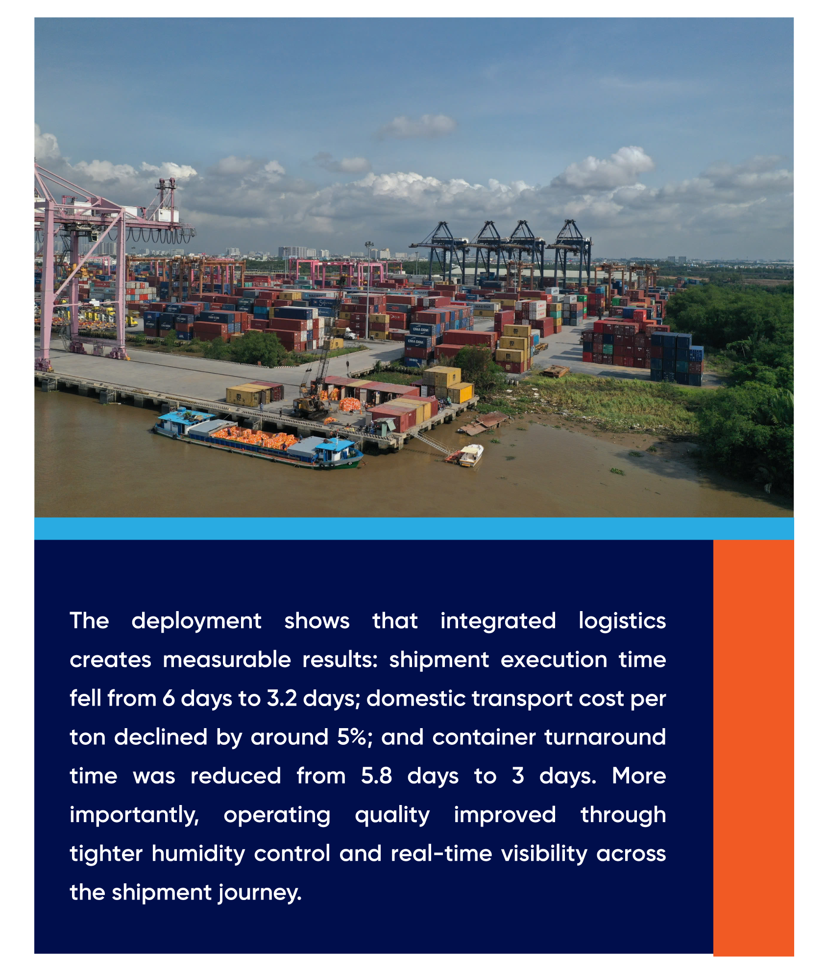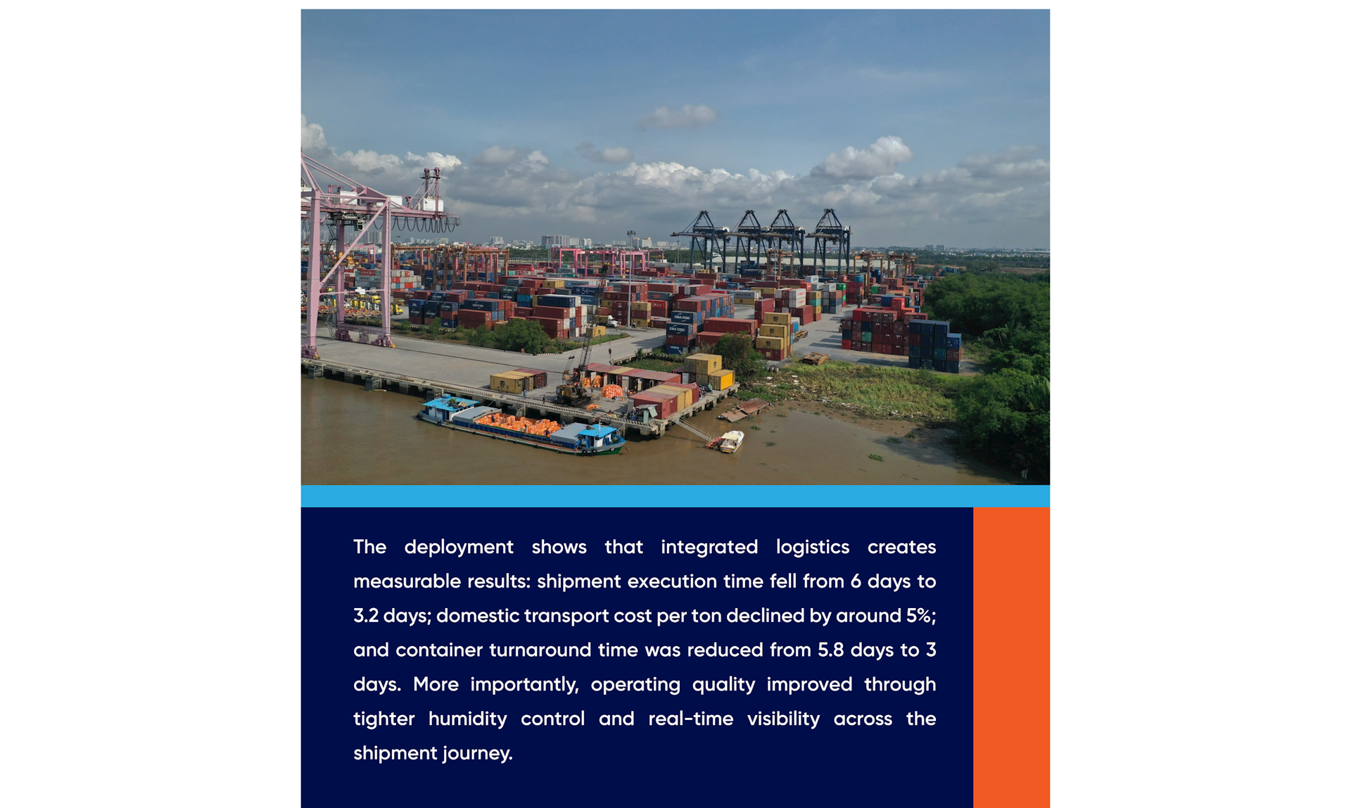 Initial operating results show clear improvements. Export shipment lead time fell by nearly 50%, from 6 days to 3.2 days. Domestic transport cost per ton dropped by about 5%. Container turnaround time was cut from 5.8 days to 3 days. Notably, humidity-related issues seen earlier did not recur during the evaluation period. Visibility and control also shifted from a fragmented state to an end-to-end synchronized process.