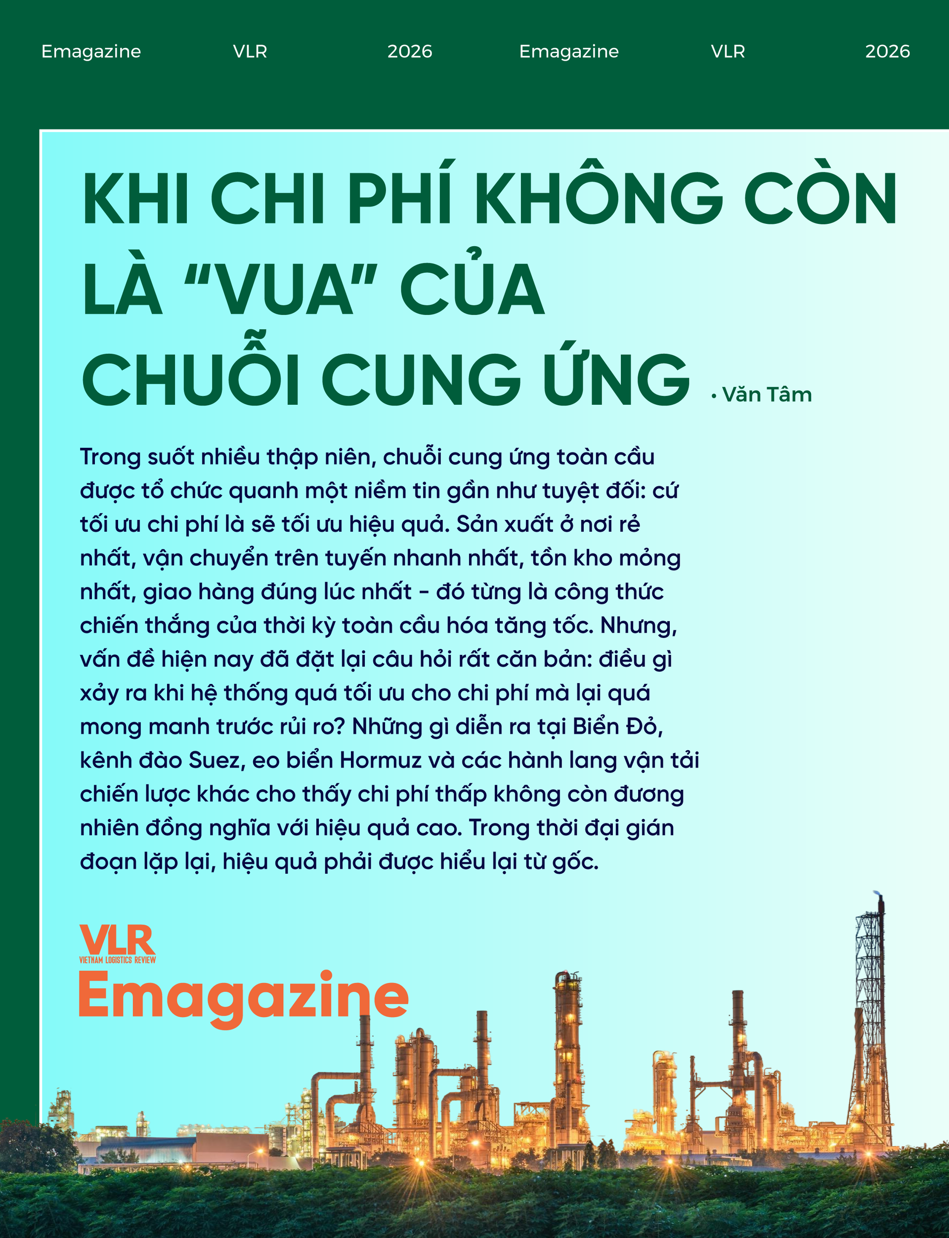 Khi chi phí không còn là “vua”, chuỗi cung ứng toàn cầu buộc phải bước sang một chuẩn hiệu quả mới. Chuẩn ấy không bác bỏ logic tối ưu hóa, nhưng buộc nó phải được đặt dưới một mái nhà rộng hơn của quản trị rủi ro, đa dạng hóa và chống chịu. Trong thập niên 2020, những doanh nghiệp có thể giao hàng đáng tin cậy hơn trong thời điểm bất ổn sẽ là những doanh nghiệp sở hữu lợi thế thực chất hơn. Và đó có lẽ là thay đổi lớn nhất mà các cú sốc từ eo biển Hormuz, Biển Đỏ hay kênh đào Suez đang buộc thế giới phải học lại.
