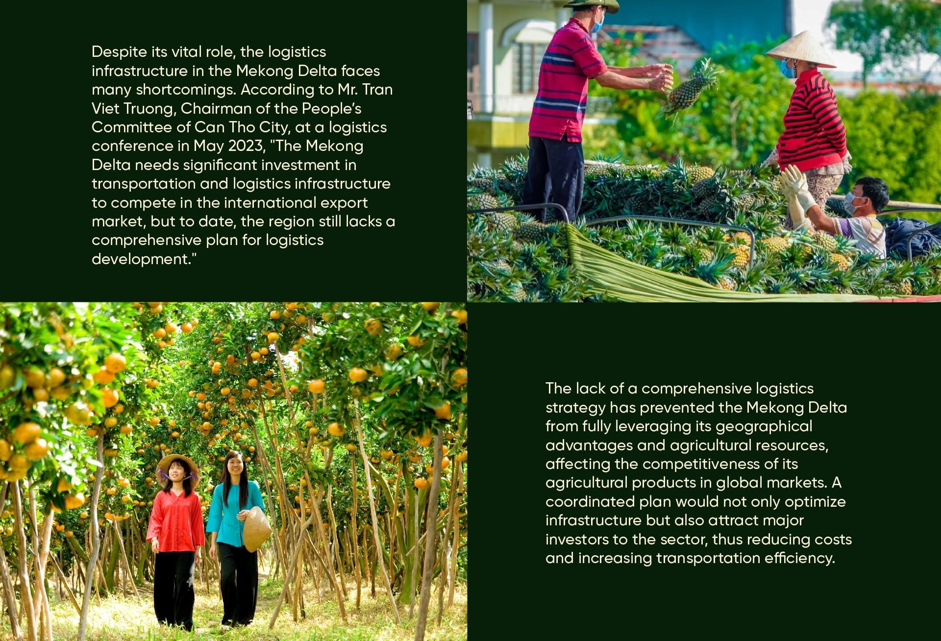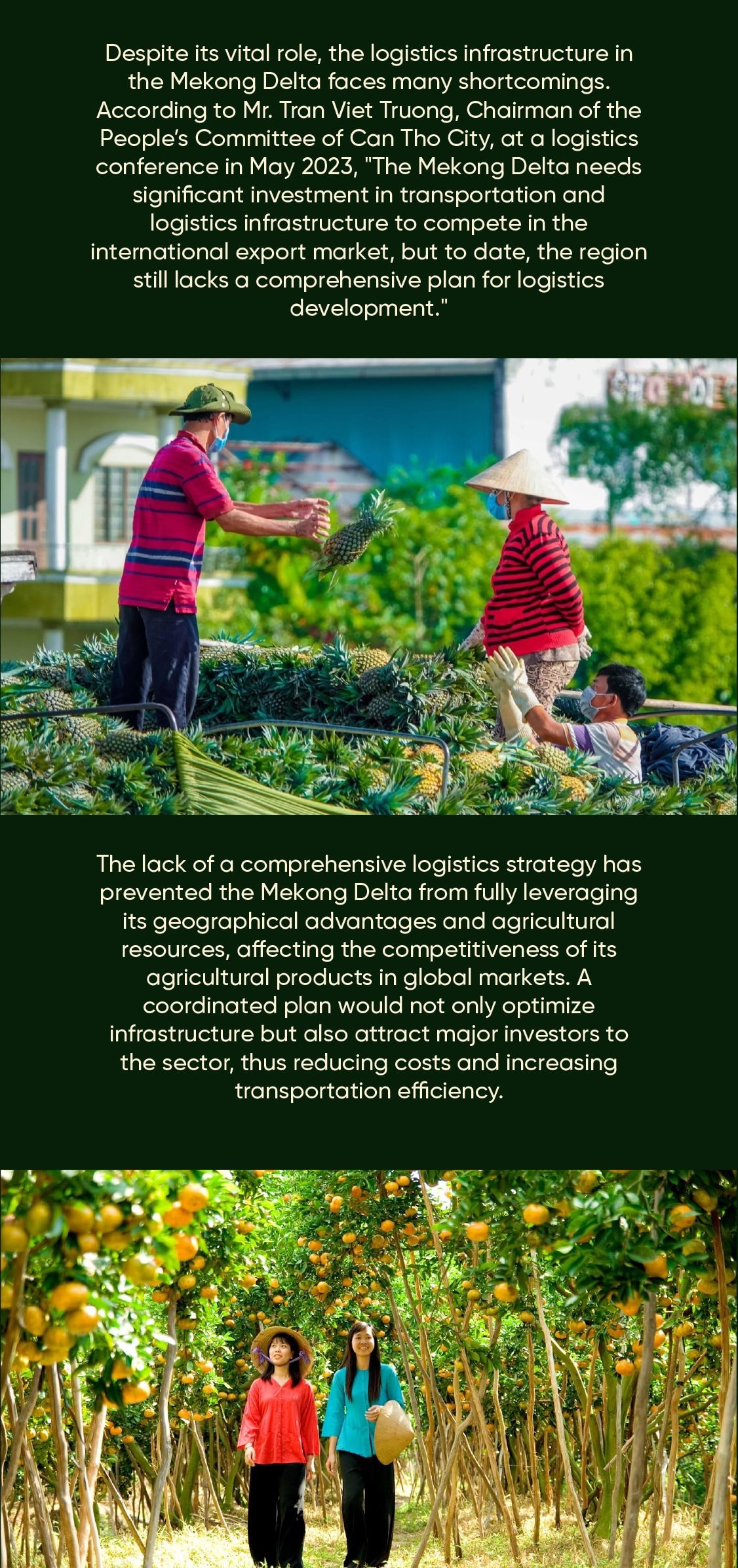 However, for agricultural products from the Mekong Delta to compete in international markets, modern and efficient logistics services are key. This requires the region to have robust transportation and warehousing infrastructure to handle large volumes of goods, ensuring product quality reaches global consumers.