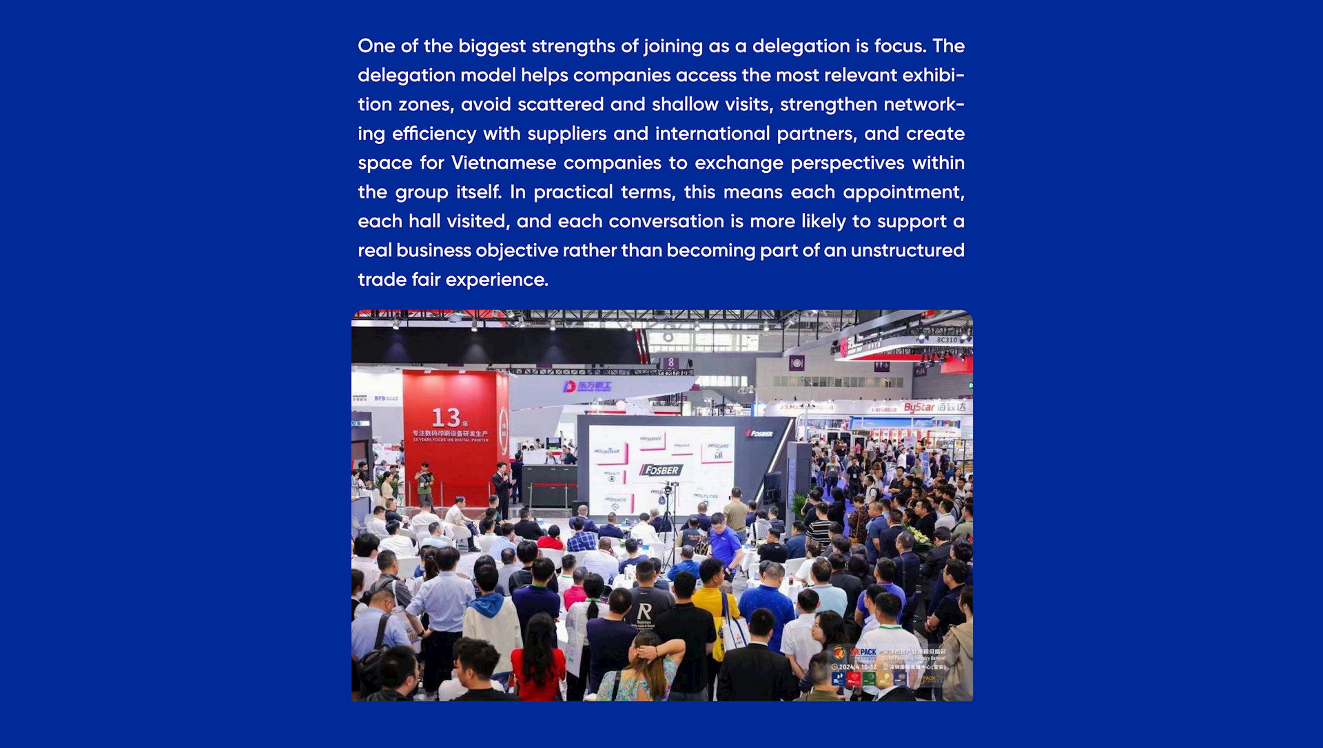 Another advantage, often underestimated, is credibility. When Vietnamese businesses participate through a professionally organized program, their presence is perceived differently by international counterparts. It is no longer a series of isolated meetings; it becomes a coordinated appearance with preparation, structure, and purpose. In B2B trade, the perception of professionalism often creates the first layer of trust before discussions even move into capacity, pricing, or purchasing terms.