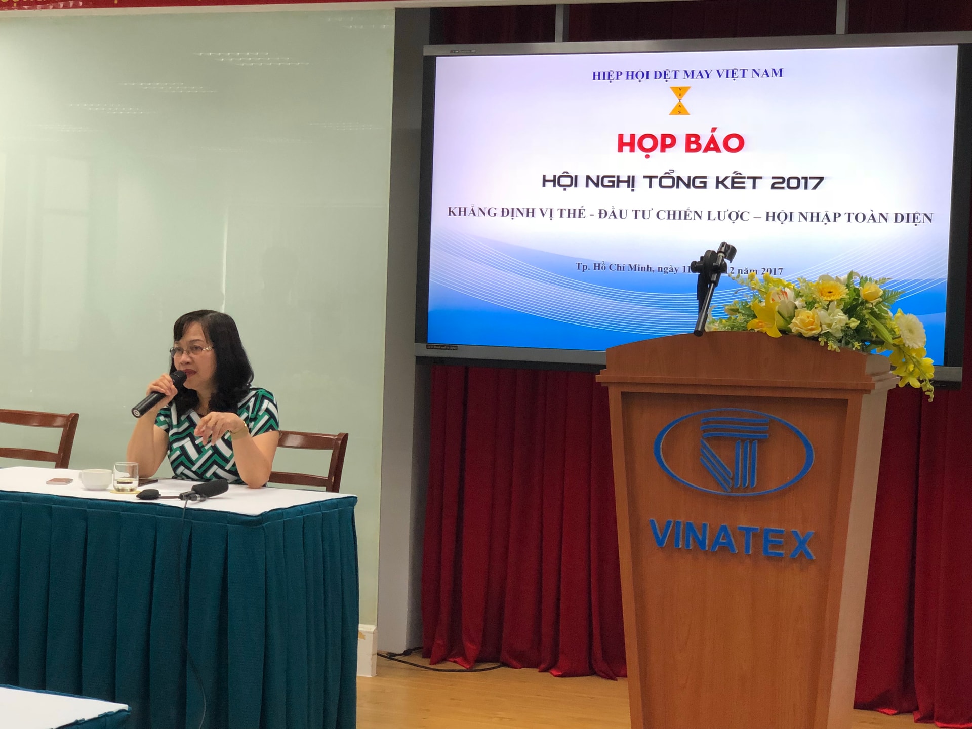 Tại buổi họp báo Hiệp hội Dệt may Việt Nam cũng cho biết, Hội nghị tổng kết Hiệp hội Dệt may Việt Nam năm 2017 sẽ được tổ chức tại thành phố Đà Nẵng vào ngày 15/12 sắp tới với sự tham gia của toàn thể hội viên