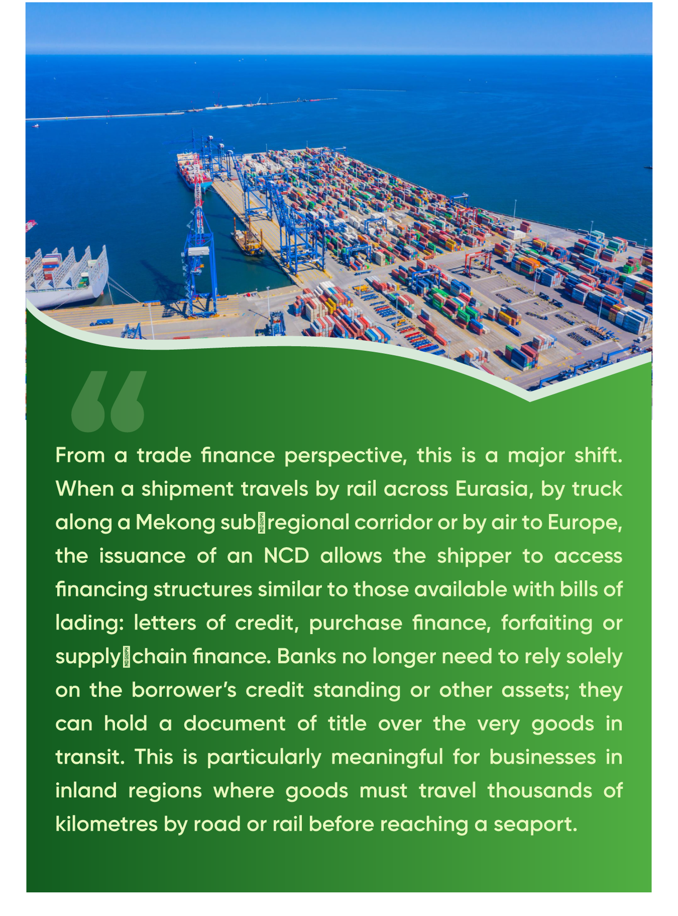 Equally important, the NCD framework has been crafted to work smoothly in the digital environment. The Convention gives full legal recognition to electronic NCDs (eNCDs), building on UNCITRAL’s Model Law on Electronic Transferable Records (MLETR). When rights over goods are “packaged” into transferable electronic records, the transfer of ownership to a new buyer – or to a bank as collateral – can occur almost instantly. This substantially reduces the risk of document delays, shortens the cash conversion cycle and improves the ability of supply chains to respond to disruptions.