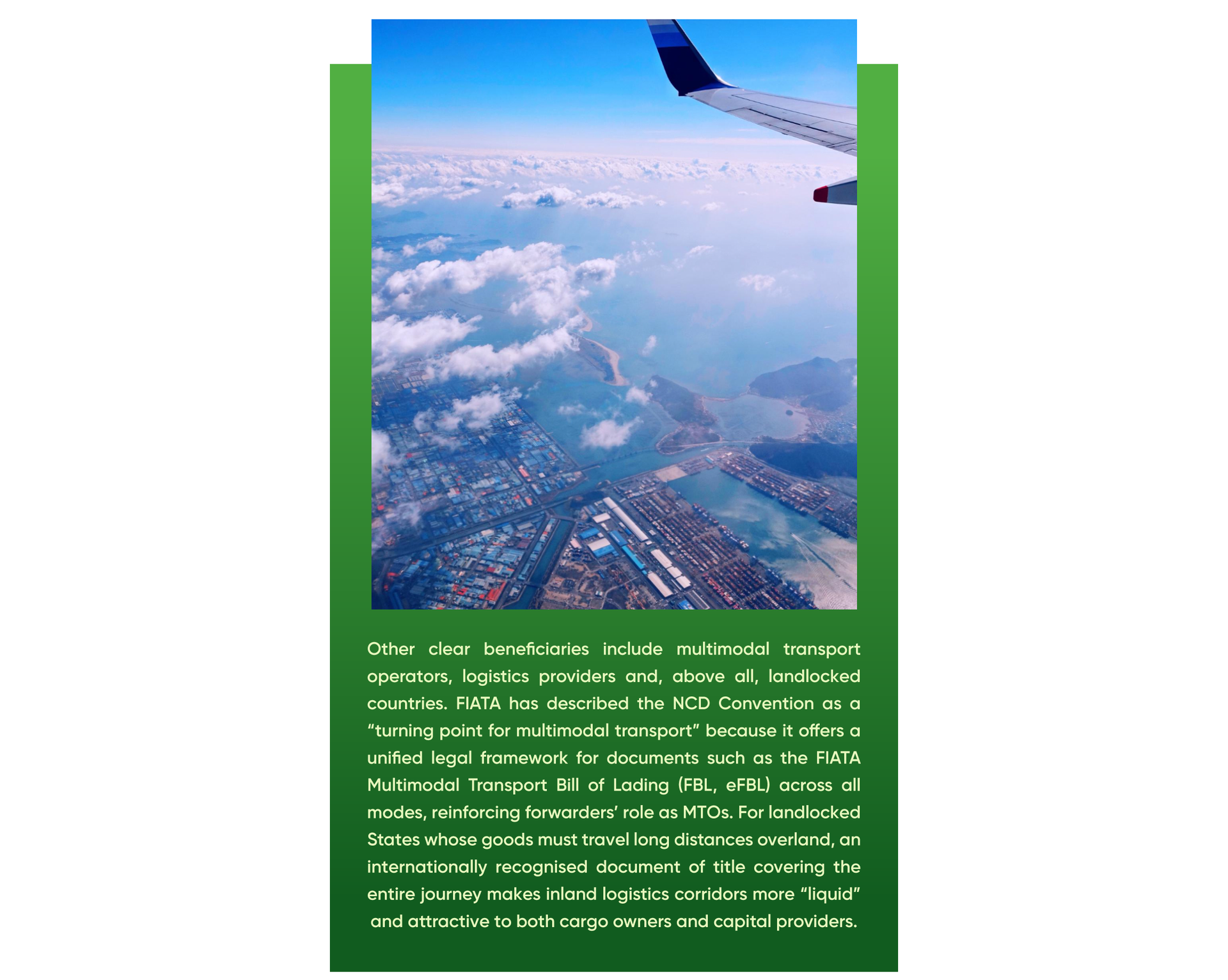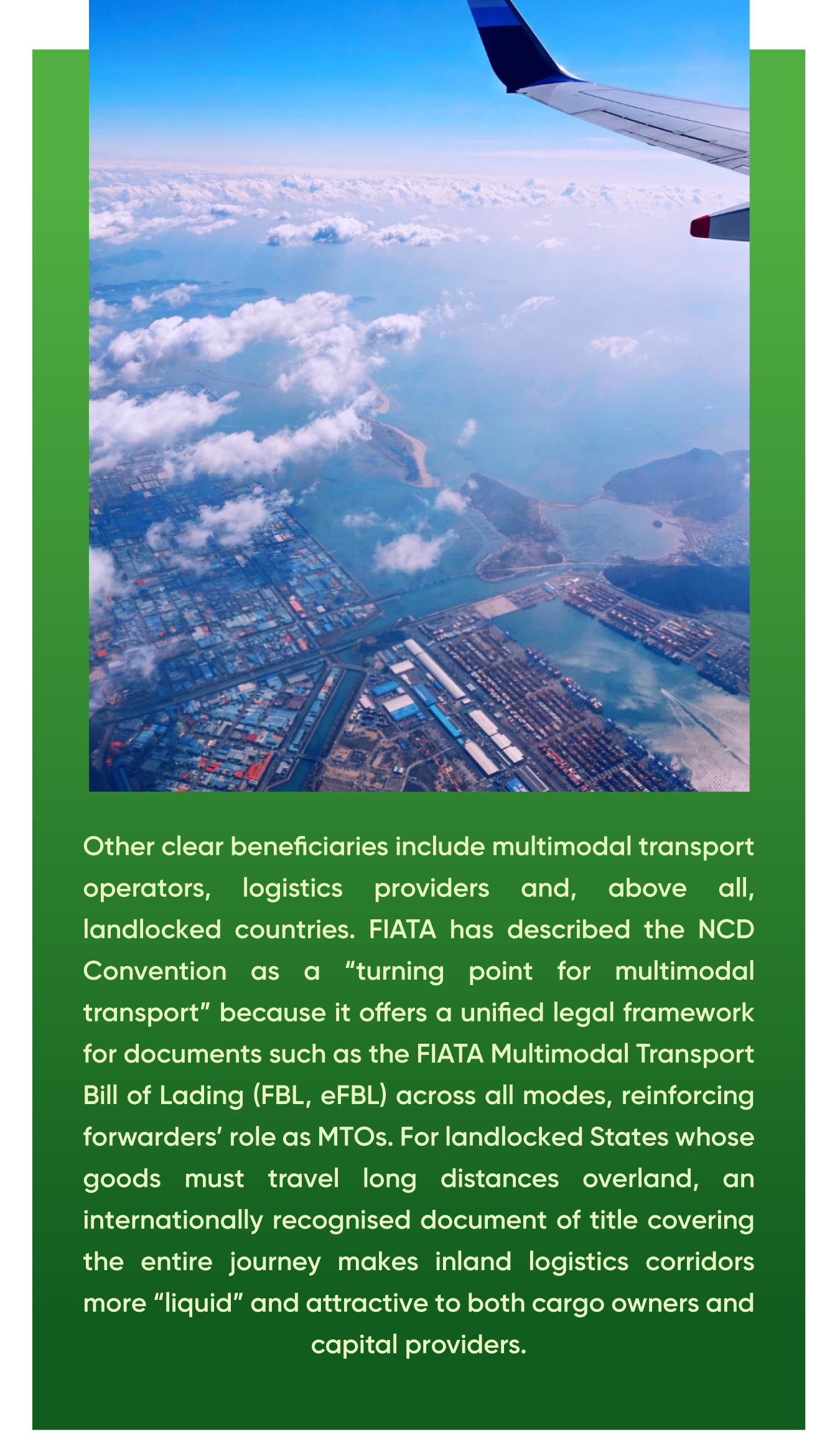 The FAQ developed by ESCAP, UNCITRAL, FIATA, ICC and the Global Shippers Forum stresses that the NCD Convention benefits many actors along the supply chain, but three groups stand out: traders, financial institutions and landlocked States together with multimodal logistics corridors.