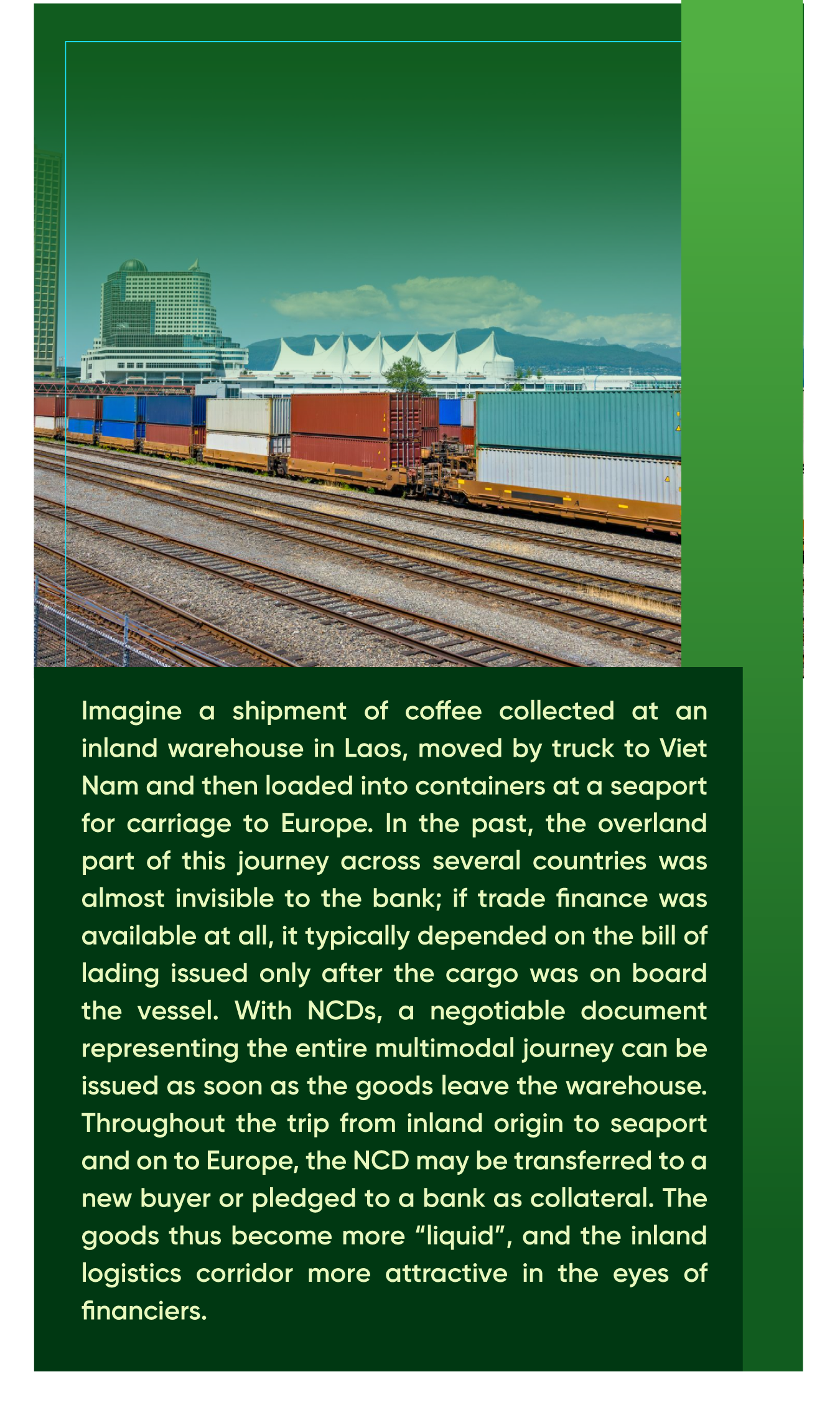 For traders – including exporters, importers and commodity merchants – NCDs greatly enhance their ability to manage market risk. When demand at a destination falls, or political risks, sanctions or regulatory changes make a market less attractive, businesses can resell goods already in transit to another buyer and transfer the NCD, instead of cancelling contracts, diverting cargo or accepting losses. Having a standardized document of title for all modes makes sales of goods in transit less legally adventurous.