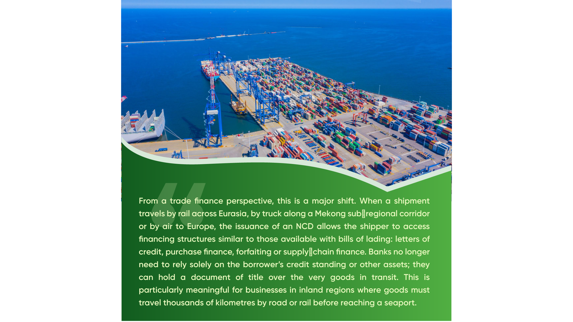For banks and other financial institutions, NCDs provide a new layer of collateral. Rather than restricting their portfolios to shipments covered by bills of lading, lenders can extend financing to cargo moving by road, rail, air or multimodal routes. At UNCITRAL’s 2025 “Shaping the Future” conference, NCDs were highlighted as a potential tool for narrowing the trade finance gap, especially for small and medium‑sized enterprises that can now use shipments in transit as security without pledging additional fixed assets.