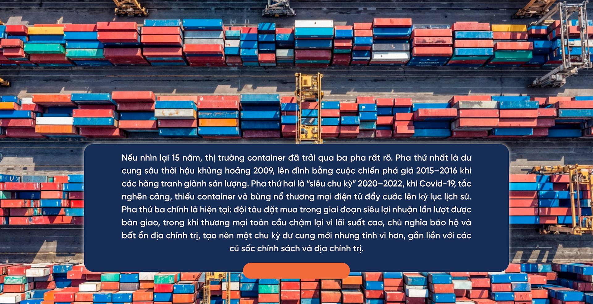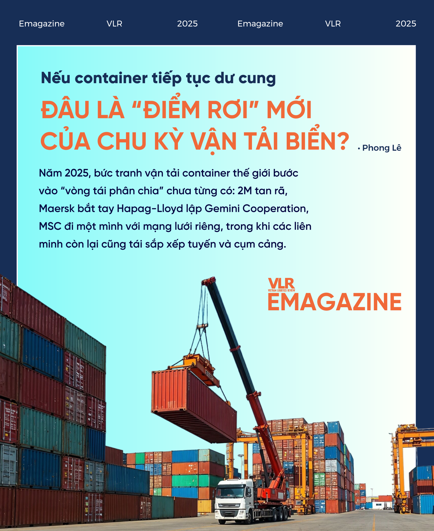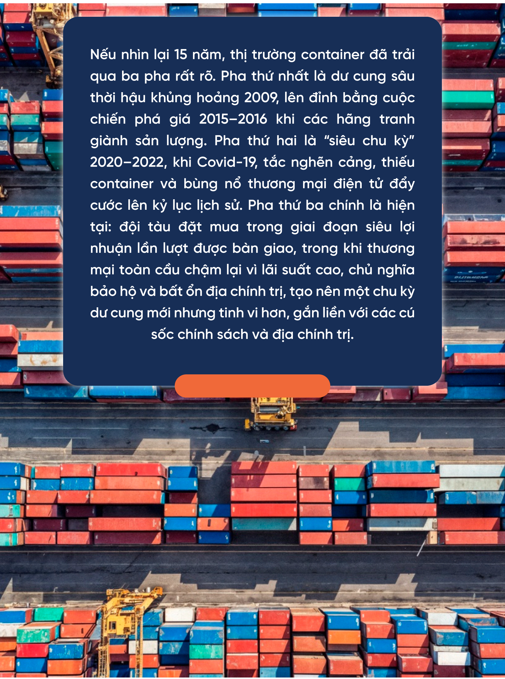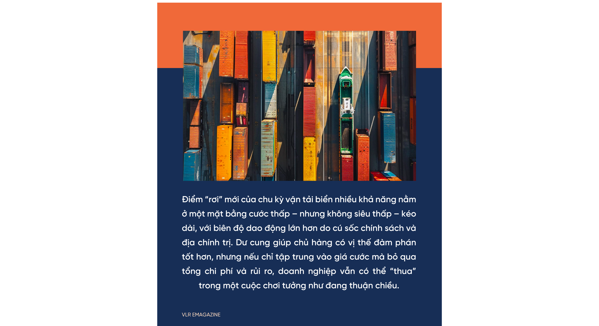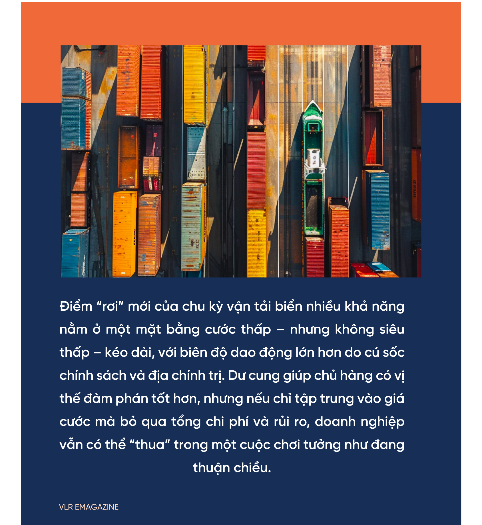Chu kỳ mới vì thế không còn đơn giản là “spot kéo hợp đồng đi lên hay đi xuống”. Các hãng tàu sử dụng nhiều công cụ để quản trị cung: blank sailing, đổi tuyến, giảm tốc độ hành trình, kéo dài thời gian quay vòng tàu để “hấp thụ” bớt công suất. Đây là lý do cước không rơi thẳng xuống đáy, mà dao động quanh một “mặt bằng mới”: thấp hơn rất nhiều so với đỉnh Covid nhưng vẫn cao hơn đáng kể so với giai đoạn 2016–2019.