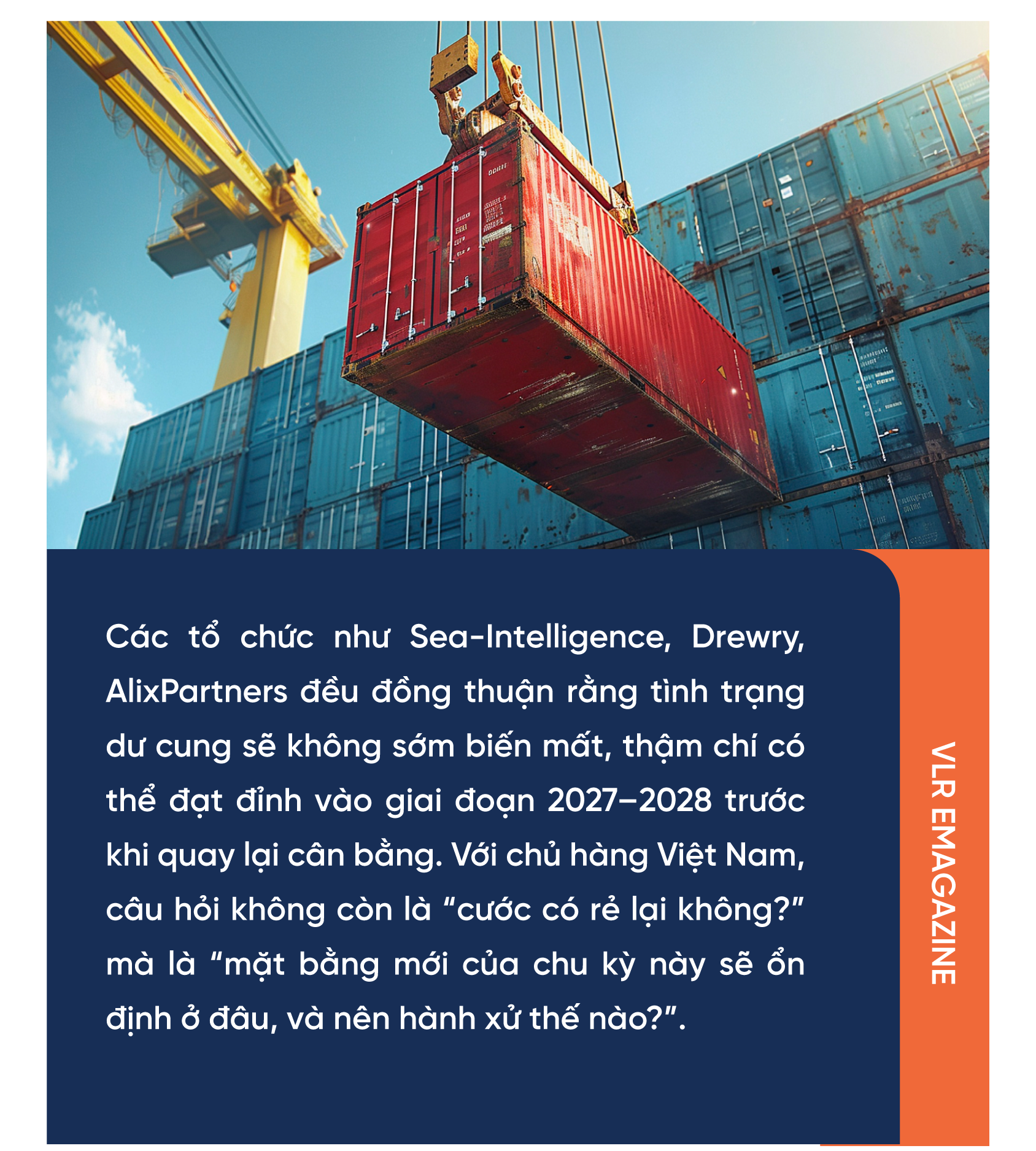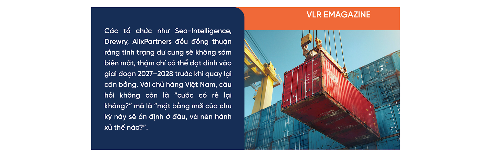 Sea-Intelligence, trong các ấn phẩm tháng 10.2025, thậm chí dự báo thị trường container toàn cầu sẽ bước vào chu kỳ dư cung kéo dài, với đỉnh overcapacity xảy ra năm 2027 ở mức tương đương cuộc “chiến tranh giá” năm 2016. Một số phân tích khác cảnh báo đường cong cung–cầu chỉ bắt đầu khép lại sau 2028 nếu tốc độ phá dỡ tàu già tăng mạnh; ngược lại, nếu việc phá dỡ chậm và đơn hàng mới tiếp tục được ký, tình trạng dư cung có thể kéo dài tới tận 2029.
