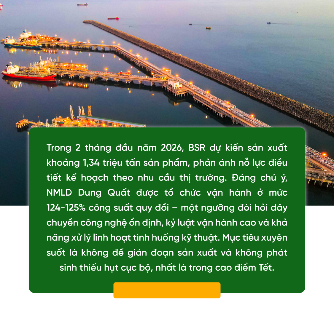 Trước dự báo nhu cầu xăng dầu tăng mạnh trong mùa Tết Nguyên đán Bính Ngọ 2026 và yêu cầu “không để thiếu hụt cục bộ” từ cơ quan quản lý thị trường, Công ty cổ phần Lọc hóa dầu Bình Sơn (BSR) đã chọn một phương án quyết liệt: vận hành Nhà máy Lọc dầu (NMLD) Dung Quất ở mức 124-125% công suất quy đổi, duy trì sản xuất liên tục, tổ chức lực lượng trực 24/24h, đồng thời đảm bảo nhập dầu thô - xuất bán sản phẩm thông suốt cả đường bộ lẫn đường biển. Đây không chỉ là bài toán sản xuất kinh doanh trong cao điểm tiêu dùng, mà còn là phép thử năng lực quản trị vận hành - an toàn - chuỗi cung ứng của một “trụ cột” năng lượng quốc gia.