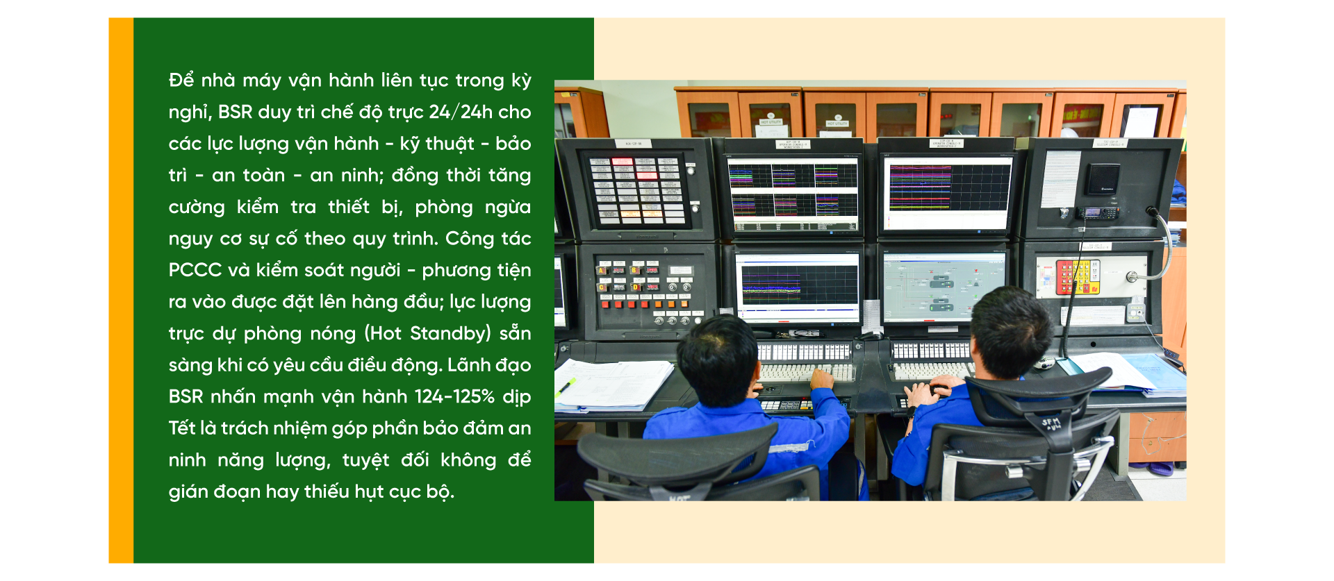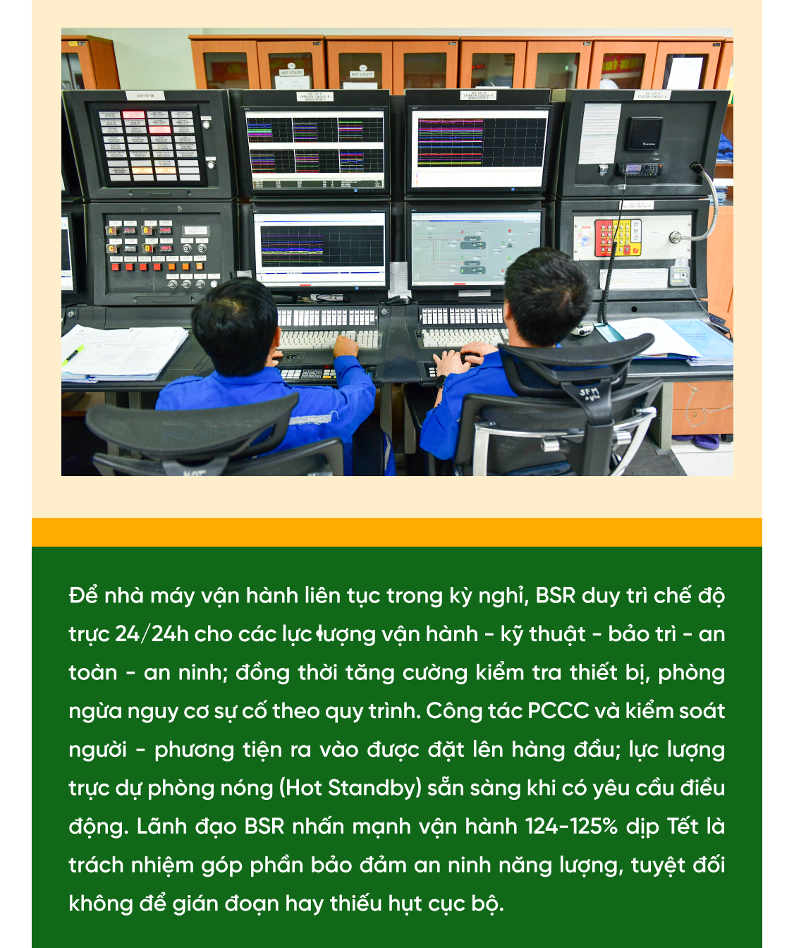 Nhưng “công suất cao” không thể đứng riêng lẻ; nó phải đi kèm an toàn - an ninh - bảo trì. BSR bố trí nhân sự làm việc theo chế độ ca kíp xuyên Tết; các bộ phận vận hành, kỹ thuật, bảo trì, an toàn, an ninh duy trì lực lượng trực 24/24h, sẵn sàng ứng phó tình huống phát sinh. Công tác bảo dưỡng, kiểm tra thiết bị được thực hiện thường xuyên theo quy trình để phát hiện sớm nguy cơ sự cố, giảm thiểu rủi ro trong giai đoạn cao tải.