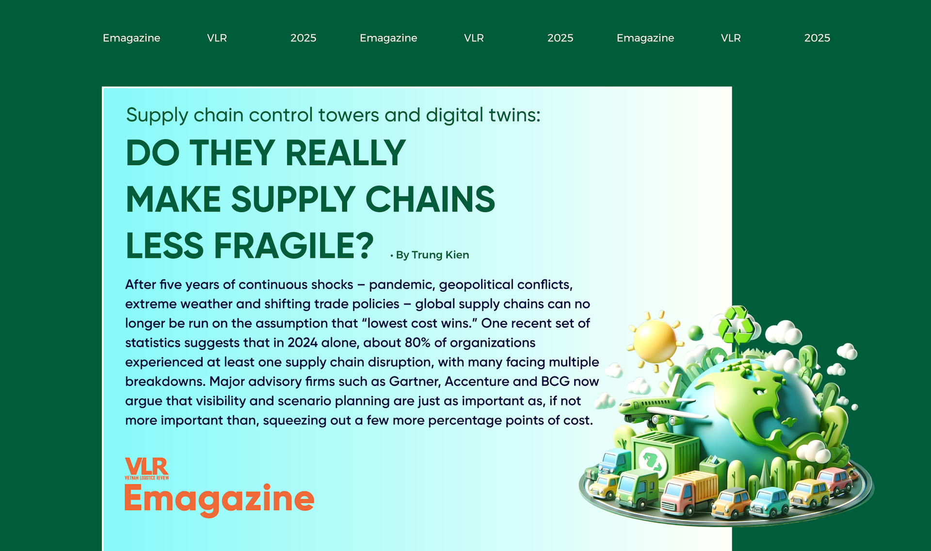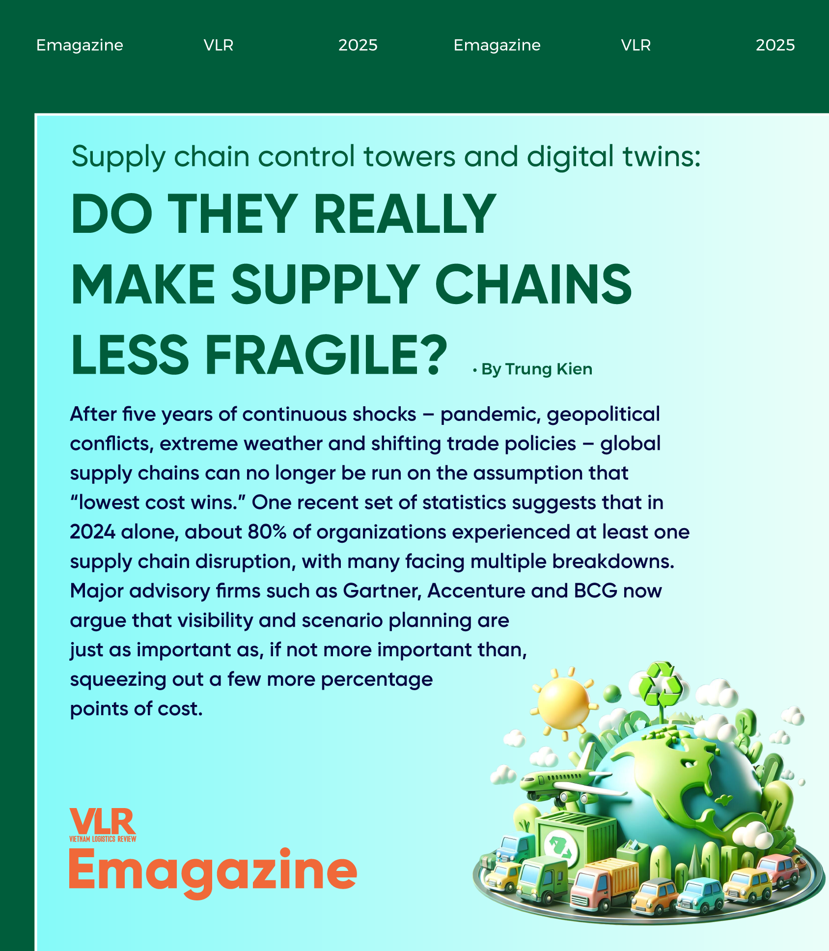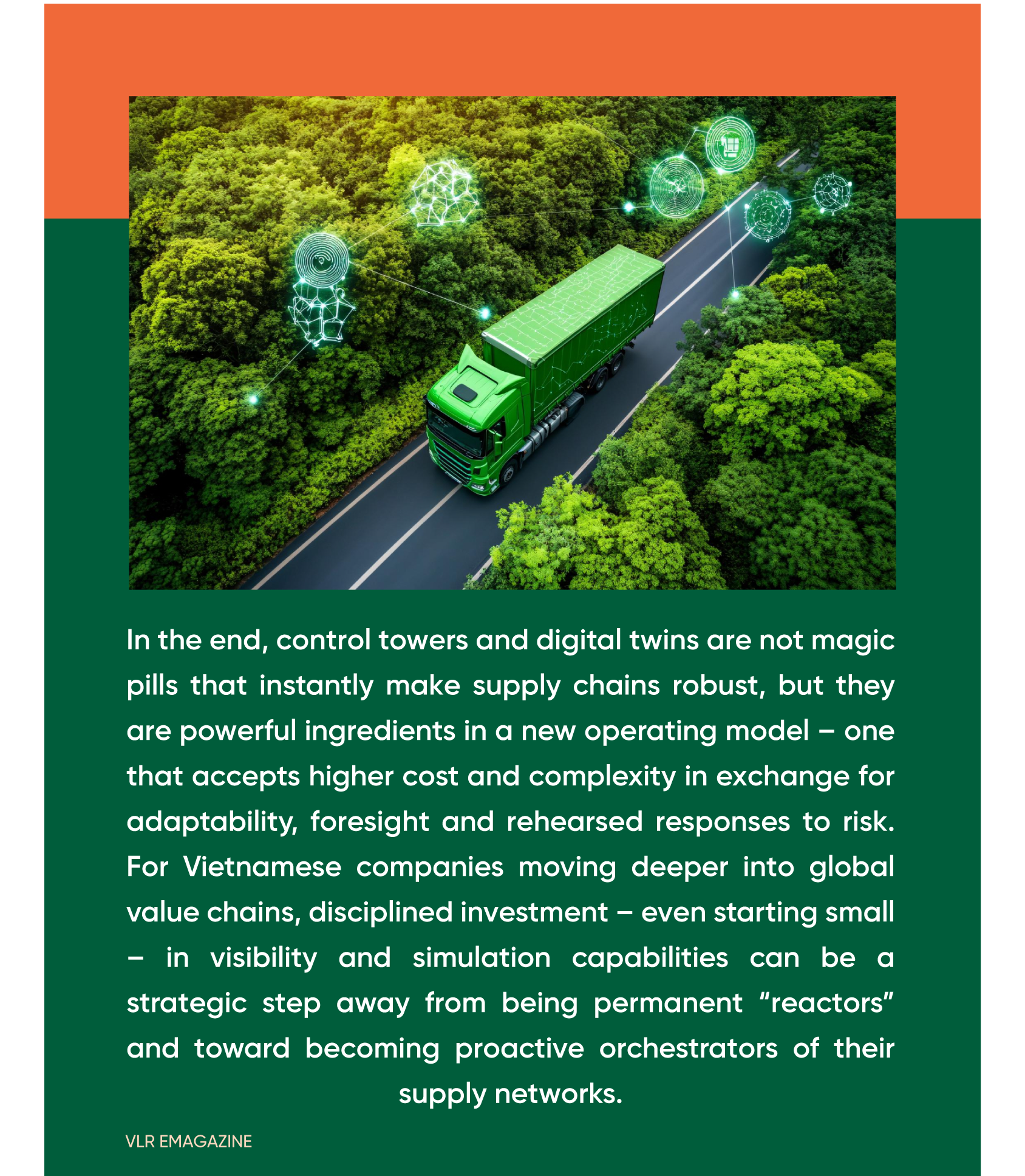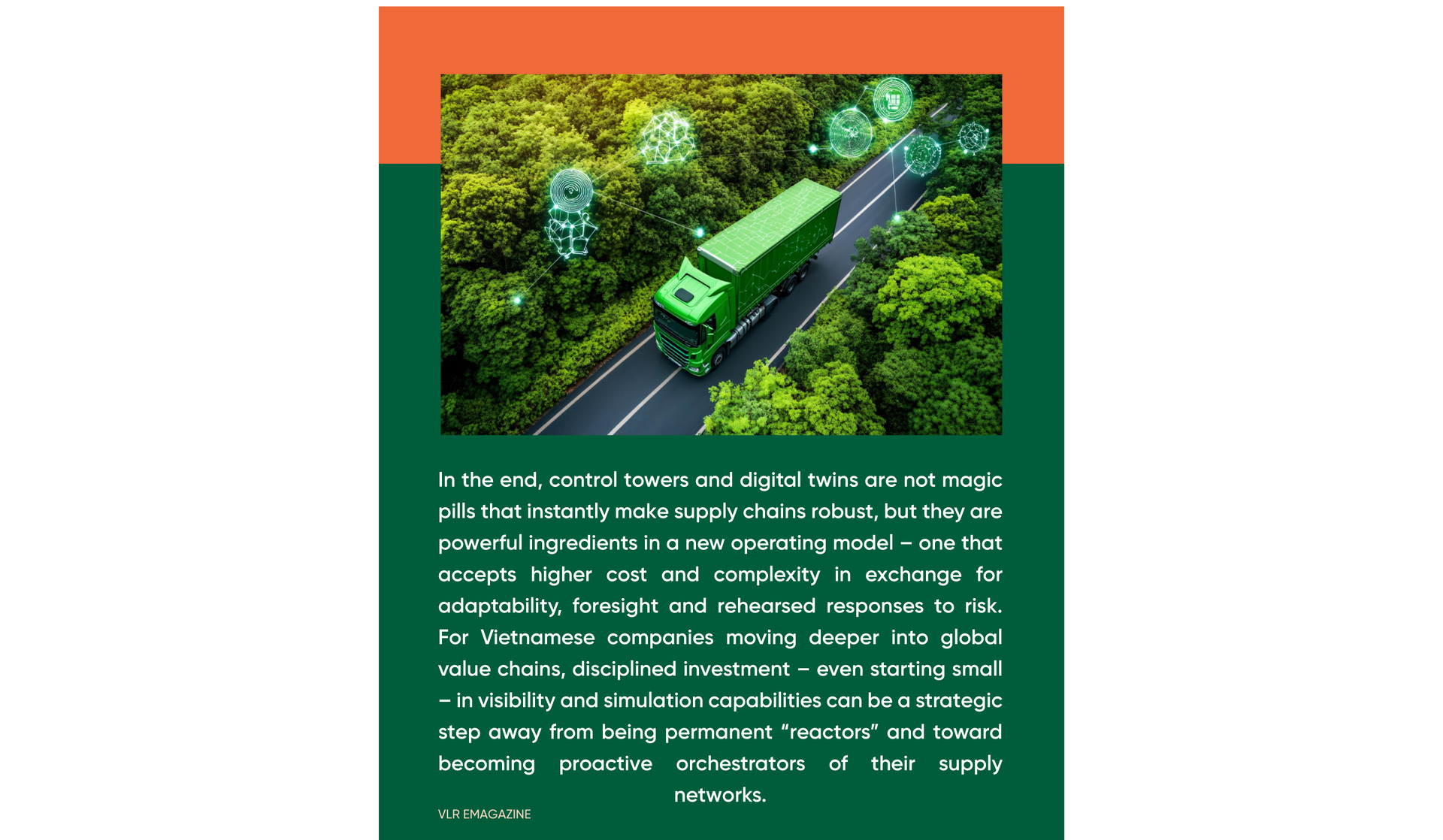 In Vietnam, consulting projects are beginning to use digital twins to optimize plant–warehouse–port networks, modelling different production-shift and transport-route scenarios as manufacturers relocate capacity and factor in rising labour and land costs. One 2025 insight report notes that digital twins are “reshaping” parts of Vietnam’s logistics and supply chain landscape as companies seek AI-powered simulations to support decisions on cost, service and resilience.