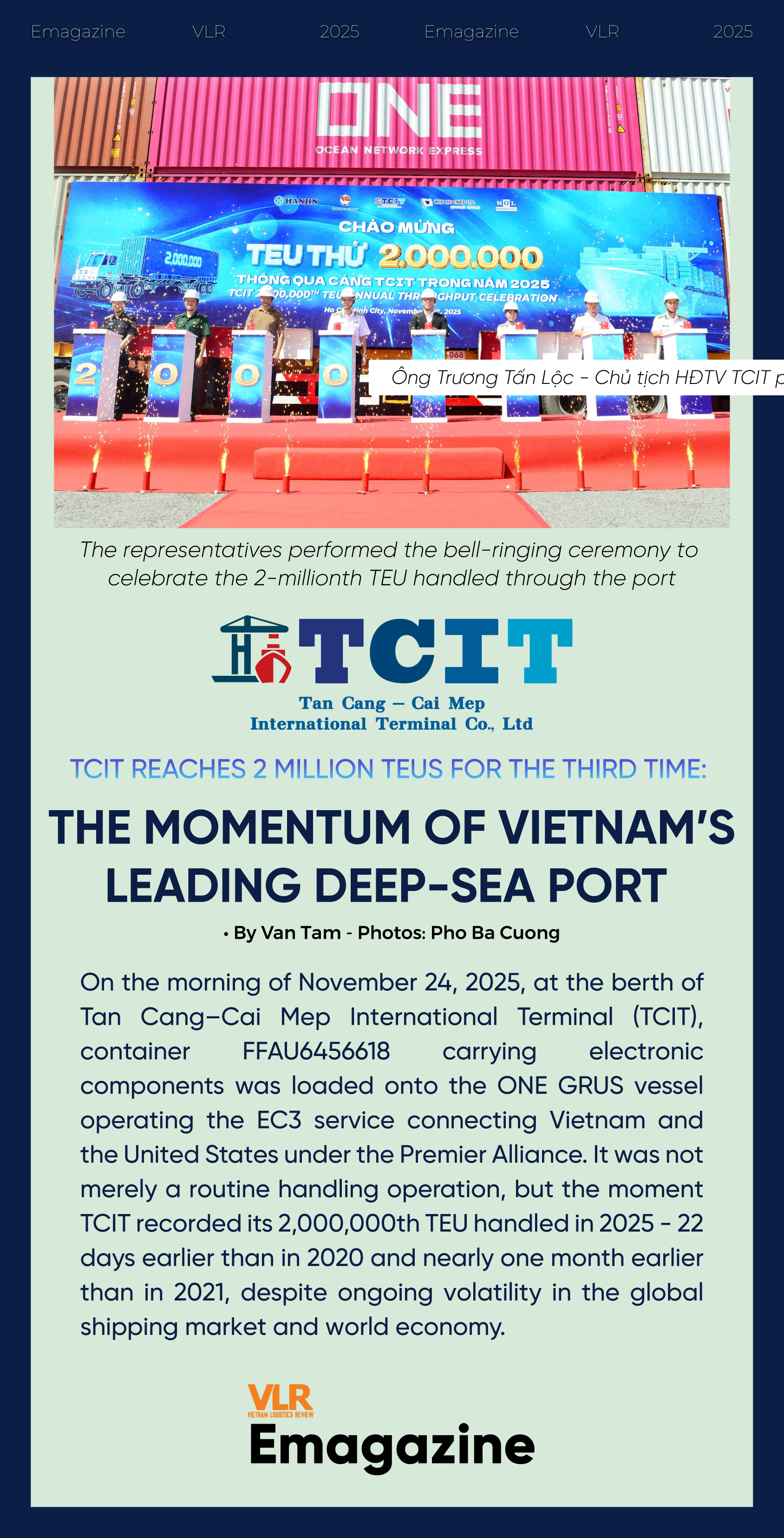 Entering 2026, as Ho Chi Minh City and surrounding areas are positioned to develop into a mega-urban region with strong investment in transport - logistics - port infrastructure, TCIT aims to firmly reinforce its standing as “Vietnam’s leading deep-sea container terminal.” The terminal will deepen integration with the network of ports, ICDs, and industrial parks, while accelerating value-added logistics services - remaining steadfast on the path of digital and green transformation, and aligning with the ESG objectives of shipping lines and customers.