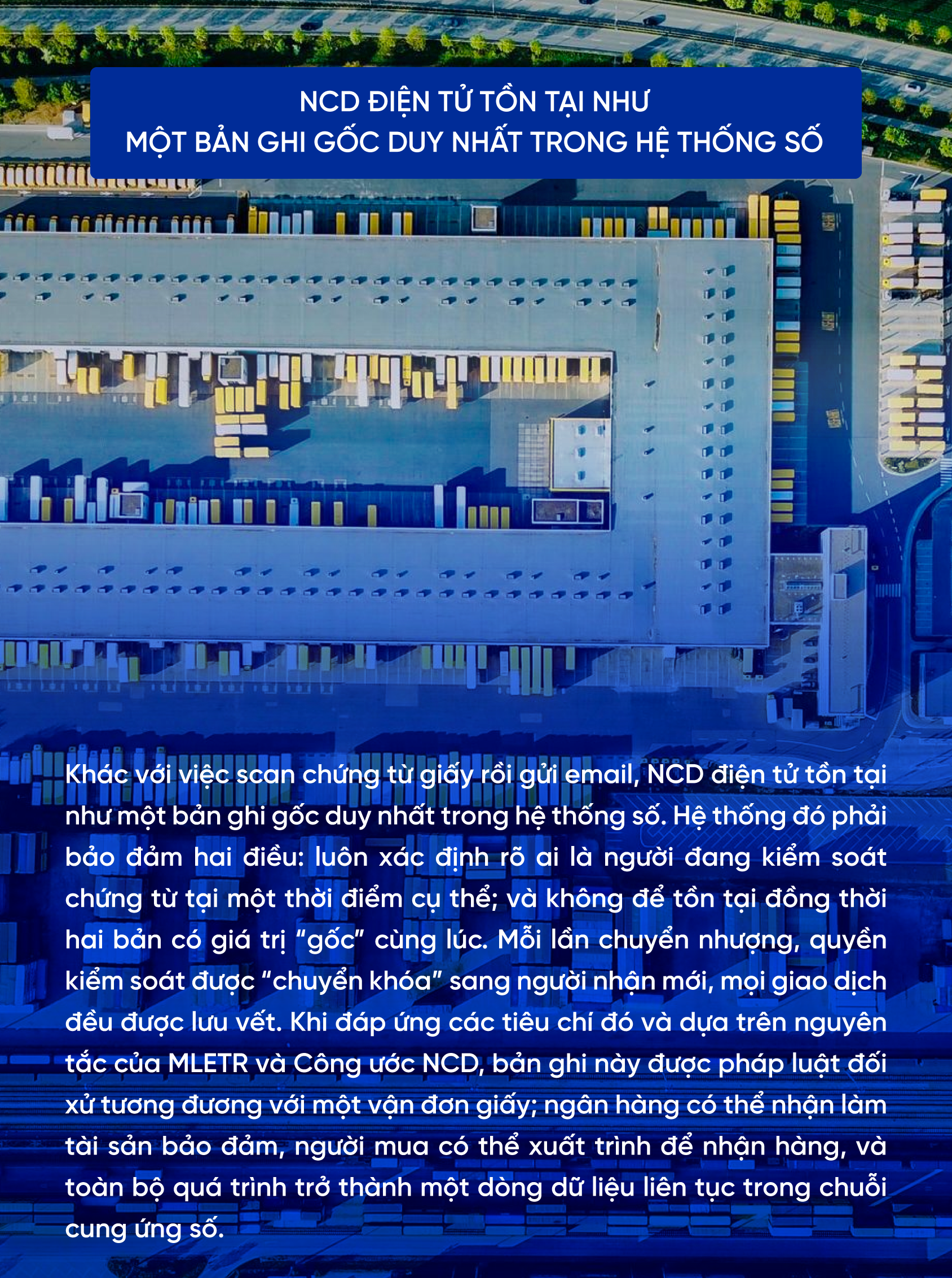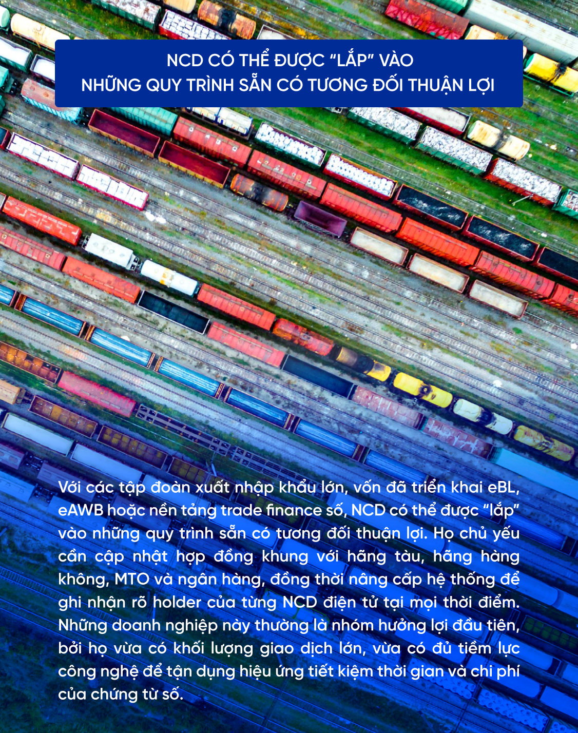 Về phía doanh nghiệp, điều này có nghĩa là một NCD điện tử được phát hành đúng chuẩn có thể mang đầy đủ chức năng của vận đơn truyền thống: xác lập quyền nhận hàng, quyền bán lại hàng, quyền khởi kiện người vận tải… mà không cần phải chờ ký tá, in ấn, gửi chuyển phát nhanh. Thời gian chuyển giao quyền sở hữu được rút xuống gần như tức thời, mở đường cho các mô hình kinh doanh linh hoạt hơn, đặc biệt trong các chuỗi cung ứng thường xuyên phải đổi điểm đến hoặc đổi người mua vào phút cuối.