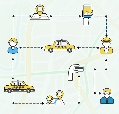 Để thực hiện được việc đặt xe thông qua ứng dụng, trước hết khách hàng phải cài đặt ứng dụng của hãng taxi vào thiết bị điện thoại của mình và thực hiện các bước đăng ký tạo tài khoản kèm theo yêu cầu cung cấp email, số điện thoại và có thể là cả số tài khoản ngân hàng. Sau khi truy cập vào ứng dụng, người dùng nhập vào điểm đến mong muốn, địa điểm đón và thời gian đón trên giao diện chính, ứng dụng sẽ tự động hiển thị thông tin về những chiếc xe taxi có ở khu vực lân cận, khoảng thời gian dự tính xe có thể đến cũng như các thông tin chi tiết về xe, tài xế, cước phí dự tính. Khi đã hoàn thành việc đặt xe, người dùng sẽ được đưa đến giao diện thanh toán. Ở đây, hành khách có thể lựa chọn một trong các hình thức mà ứng dụng cung cấp như thanh toán bằng tiền mặt, thanh toán bằng thẻ tín dụng, thanh toán bằng thẻ ghi nợ hay thanh toán bằng visa hoặc ví điện tử.