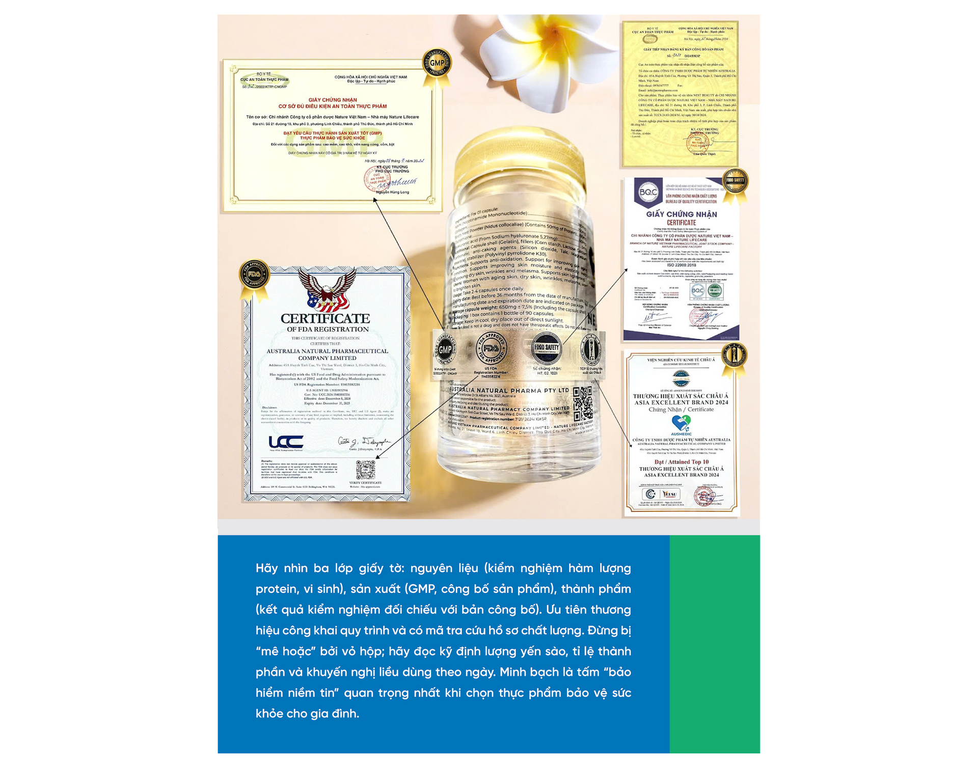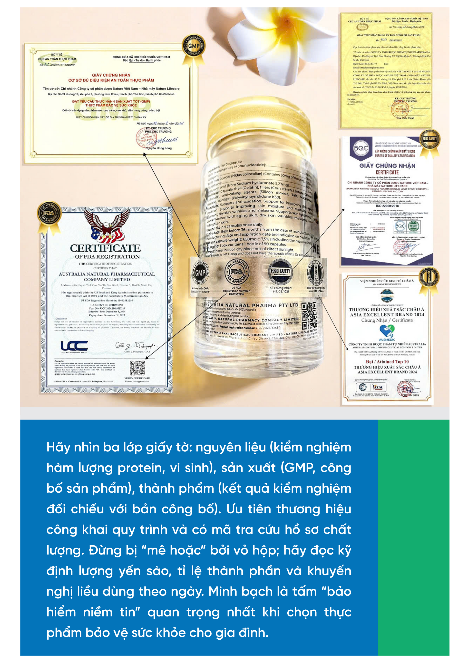 Điểm mạnh cốt lõi của Ausmedic nằm ở quy trình sản xuất đạt chuẩn GMP cùng chuỗi kiểm soát nhiều bước: chọn nguyên liệu, loại bỏ tạp và vi sinh vật gây hại, chuẩn hóa hàm lượng dinh dưỡng, kiểm nghiệm thành phẩm rồi mới đóng gói. Cách làm này giúp giảm tối đa biến thiên do “chưng tay” tại gia, đồng thời đảm bảo lô nào cũng đạt tiêu chí an toàn - chất lượng đã công bố. Sau những biến động của thị trường thực phẩm chức năng, minh bạch trở thành “điểm cộng” quan trọng: người dùng có thể đối chiếu COA, giấy tờ pháp lý, kết quả kiểm nghiệm trên nền tảng số hoặc mã tra cứu.