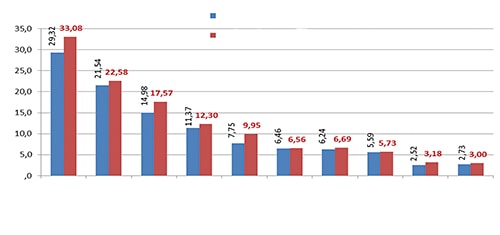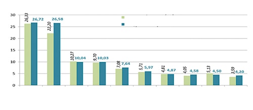 Import turnover in 2016 estimatedly reached USD 173.3bn, an increase of 4.6% compared to 2015. Fields with foreign investments reached USD 102.2bn, an increase of 5.1%; fields of local economy only reached USD 50.0bn. Electric products, computers and accessorties in 2016 imported estimatedly reached USD 27.8bn, an increase of 20.1% compared to 2015; various cellphones and accessories reached USD10.5bn, a decrease of 0.3%; machines, equipment and spare parts reached USD 28.1bn- an increase of 1.8%; chemistry subtances imported with turnover of USD 3.2bn- an increase of 1%; medicine imported with turnover of USD 2.5bn- an increase of 8.9%; in term of quantity, paper imported with the amount of 1,989,000 tons, an increase of 15.5%; gas imported, 11,471,000 tons, an increase of14.25; steel imported, 18,428,000 tons, an increase of 18.8% compared to 2015 (Chart 2).