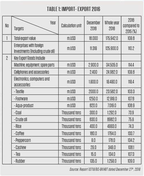 In 2016 Vietnam had trade surplus of nearly USD2.7 bn. With the export turnover of 1.52%, it can be considered a bright spot. However, our export activities have not been able to overcome existing weakness from many years: export goods are traditional products, mostly outsourced ones, and export surplus mostly from FDI enterprises. There are many issues coming from weak systems of trade and logistics: road fees are more than fees for gas; fee -collecting BOT stations are likely to be located on key transport route, causing an increase in logistics costs and a decrease in competition abilities. These things resulted in low growth of export, even a decrease in export products of advantages in the country. These are challenges for the field of export in the years to come, especially in the year of 2017.