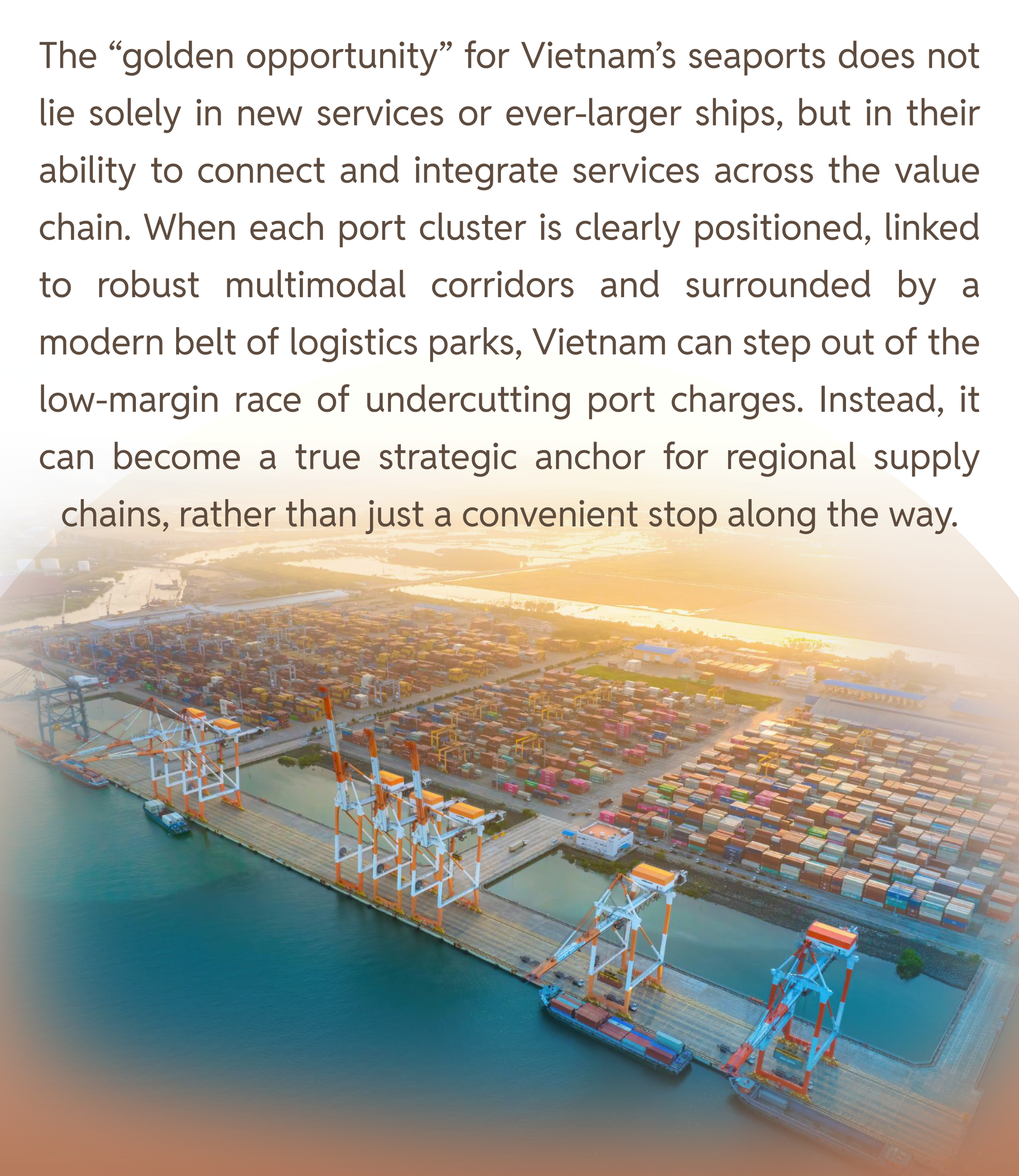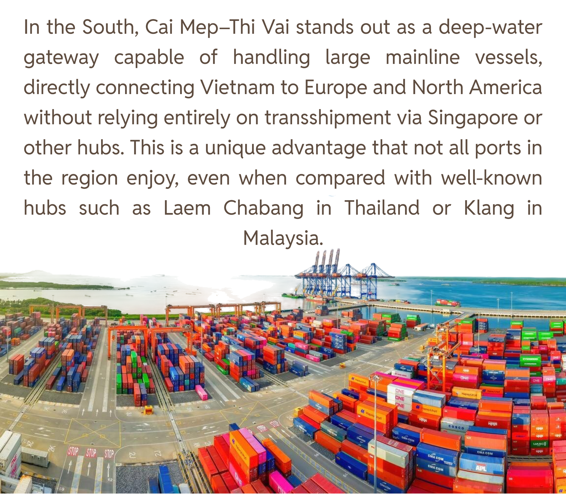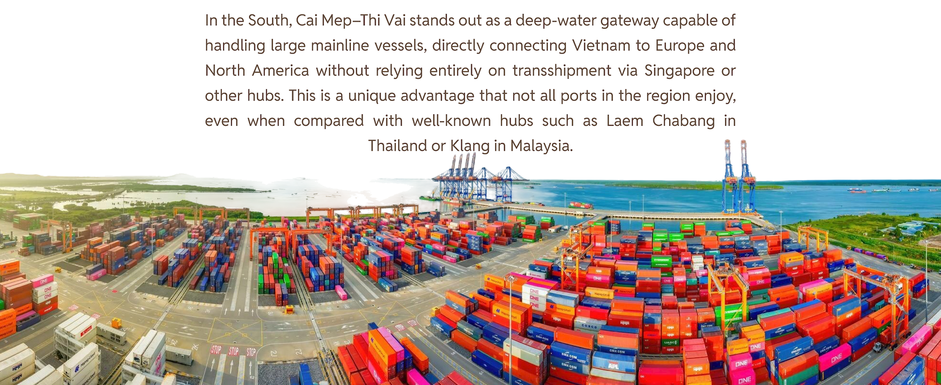 Looking at Cai Mep–Thi Vai, many analysts believe the complex has so far tapped only part of its potential. Its ambition to become a major international transshipment hub will be hard to achieve if bottlenecks in connectivity, distribution centers, empty container depots, truck yards and dry ports are not addressed decisively. A similar situation exists around Ho Chi Minh City and Hai Phong, where a truly large-scale, modern “service ring” is still missing – a ring that could both capture transshipment flows and support a full suite of value-added logistics services.