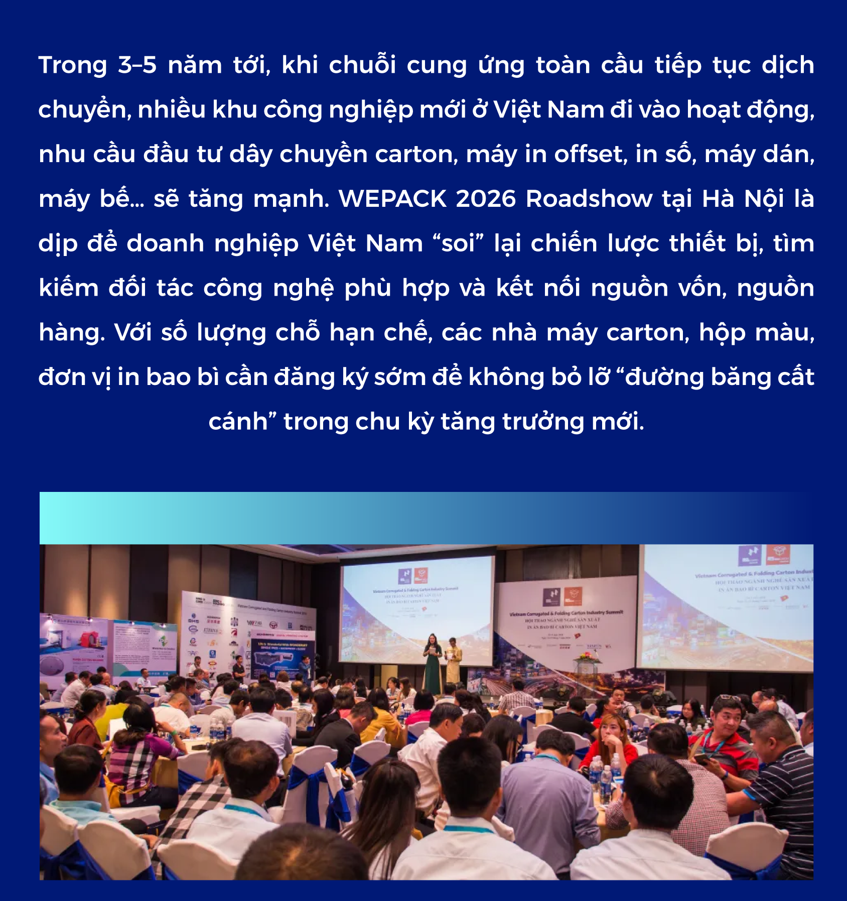 WEPACK không chỉ là tên gọi của một dòng triển lãm, mà là hệ sinh thái bao gồm chuỗi hoạt động roadshow, hội nghị ngành và triển lãm quốc tế tập trung vào toàn bộ chuỗi giá trị bao bì – từ giấy, nhựa, in ấn đến tái chế, logistics. Việc Hà Nội được chọn là điểm tổ chức roadshow cho WEPACK 2026 gửi đi một thông điệp rõ ràng: Việt Nam đang được nhìn nhận như một “mắt xích” quan trọng của chuỗi ngành bao bì toàn cầu.