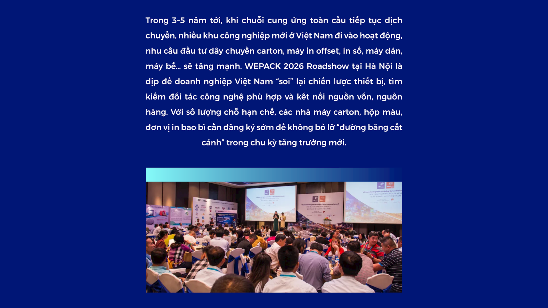 Trong bối cảnh cạnh tranh ngày càng khốc liệt, doanh nghiệp đi trước sẽ là những đơn vị nhìn thấy sớm “biển xanh” và chuẩn bị tốt cho làn sóng mới. WEPACK 2026 – Roadshow tại Hà Nội, với sự đồng hành của các hiệp hội VINPAS, VPA, VPPA, PrintPack và hệ thống khu công nghiệp trọng điểm, là lời mời gọi rõ ràng dành cho những nhà lãnh đạo bao bì muốn bứt phá.
